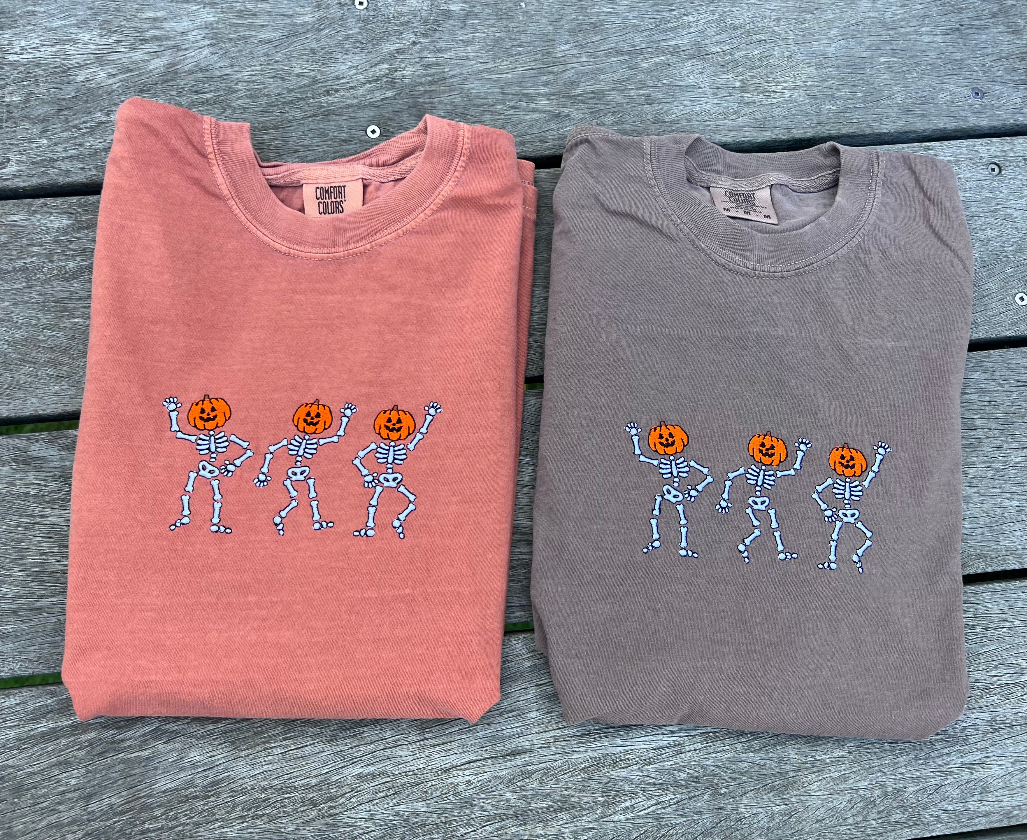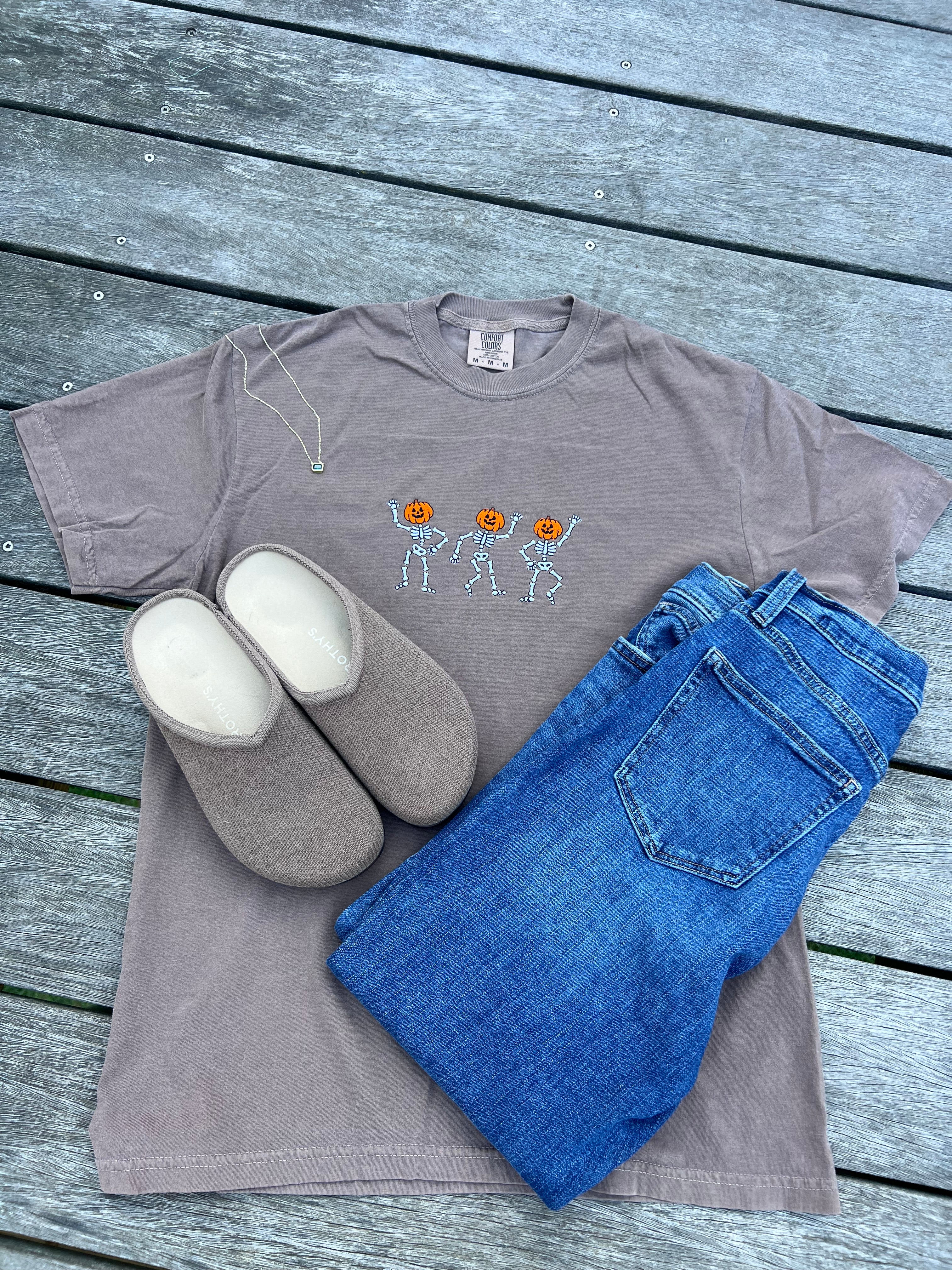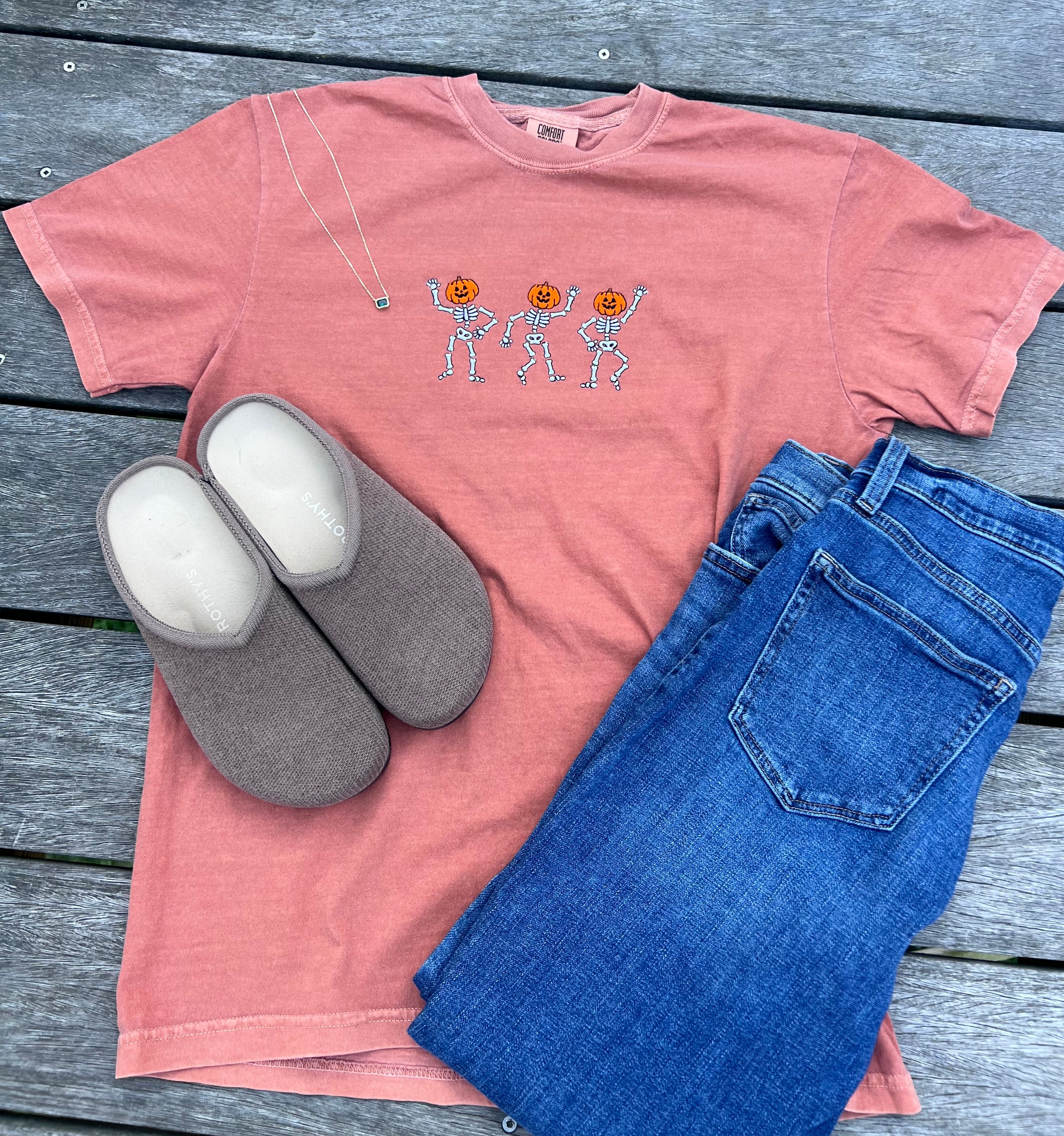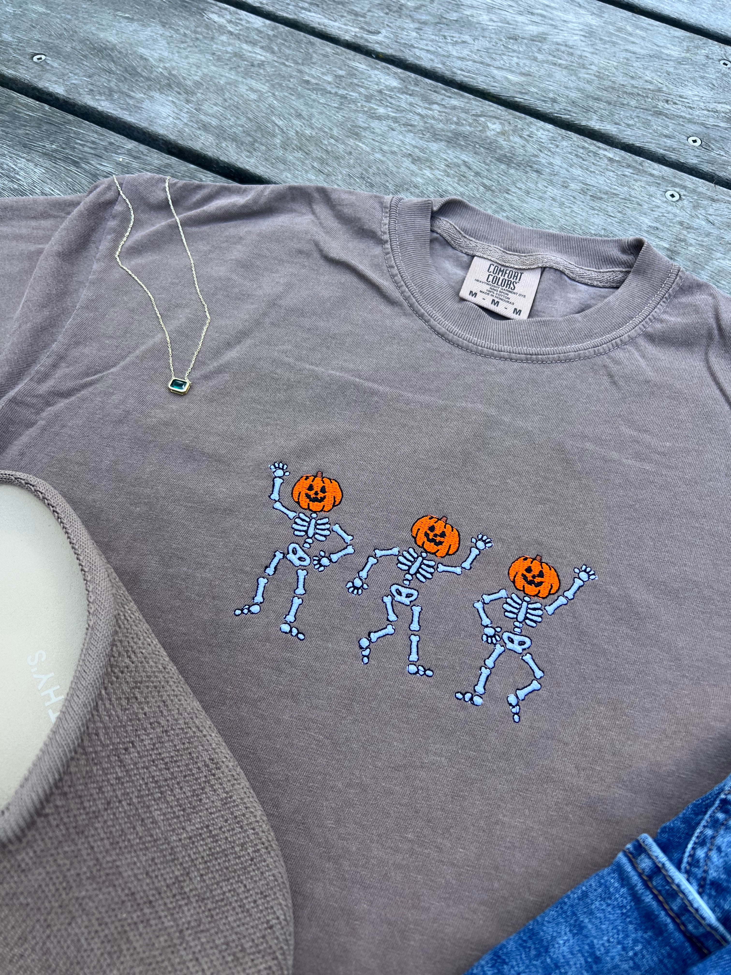(Copy) Skeletons with Pumpkin Head Embroidered T-Shirt | Spooky Fall Graphic Tee
