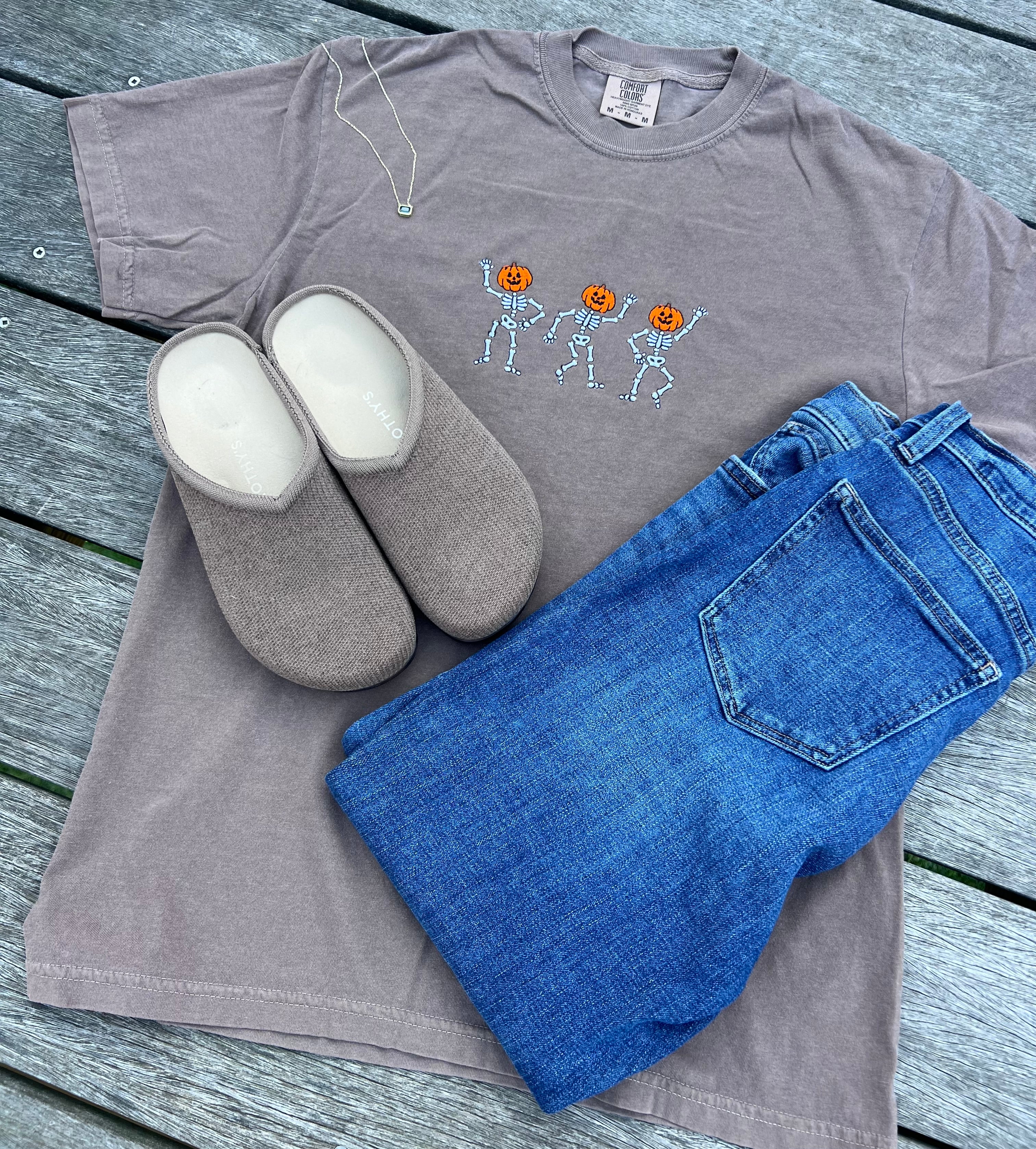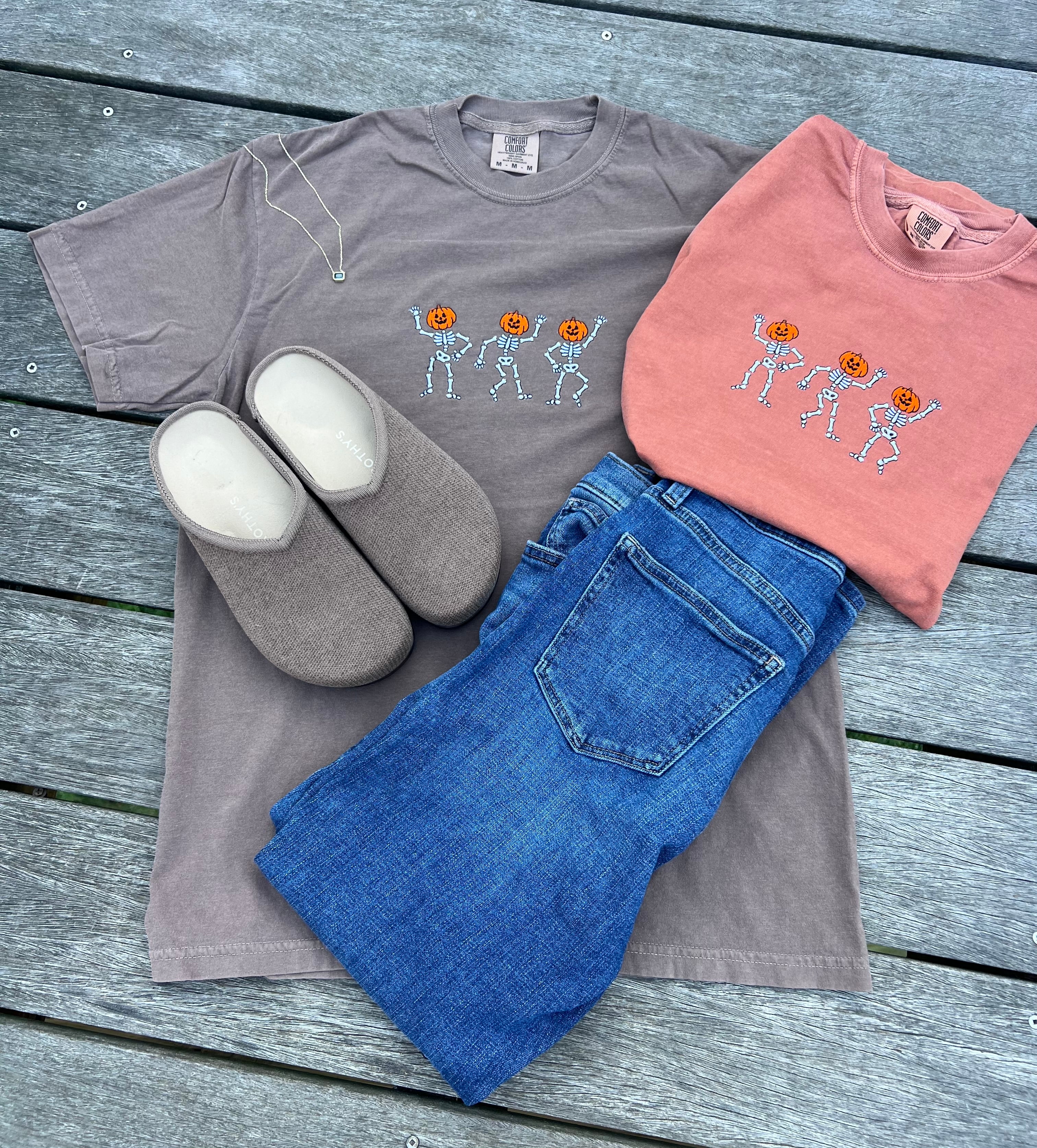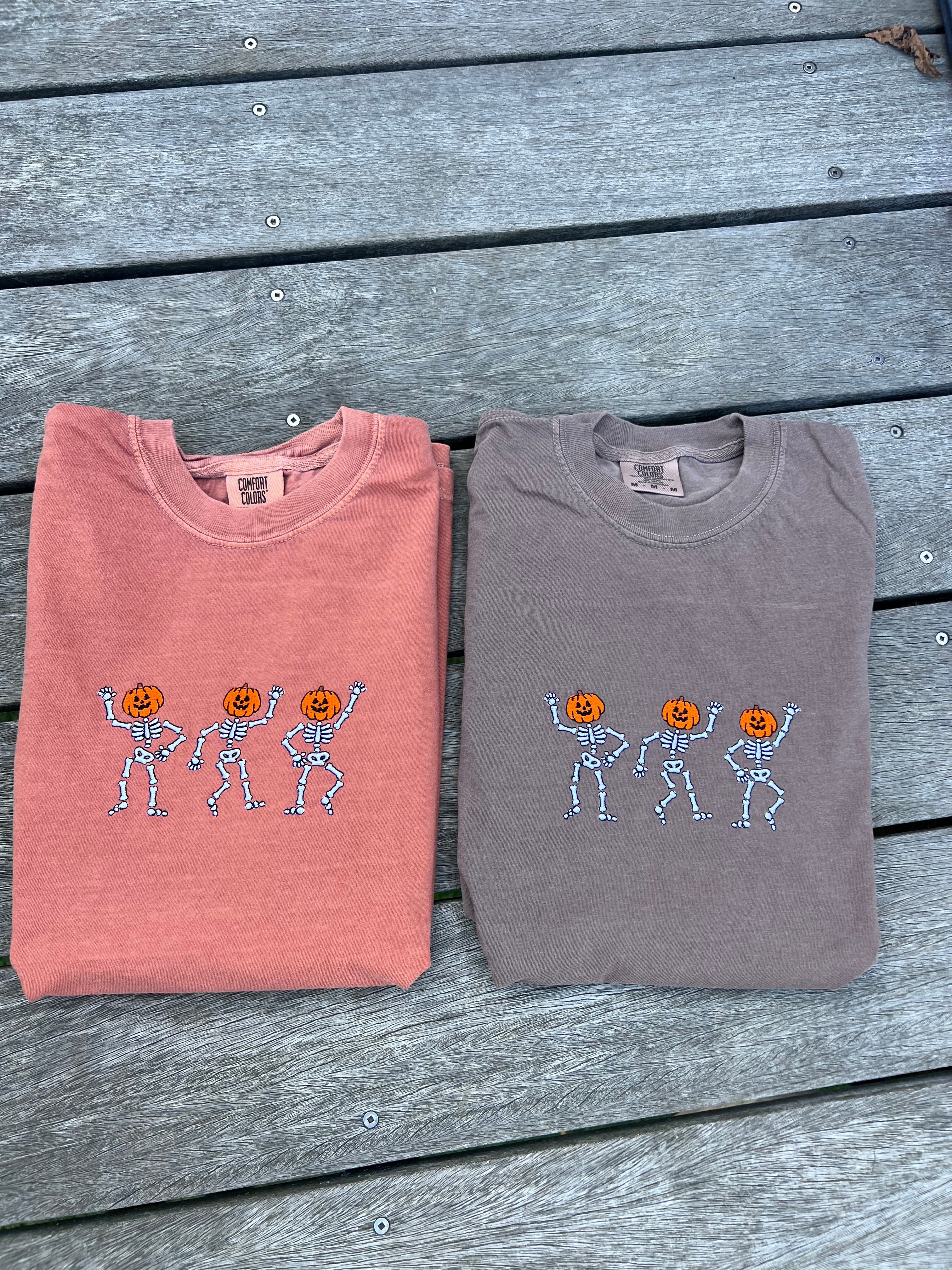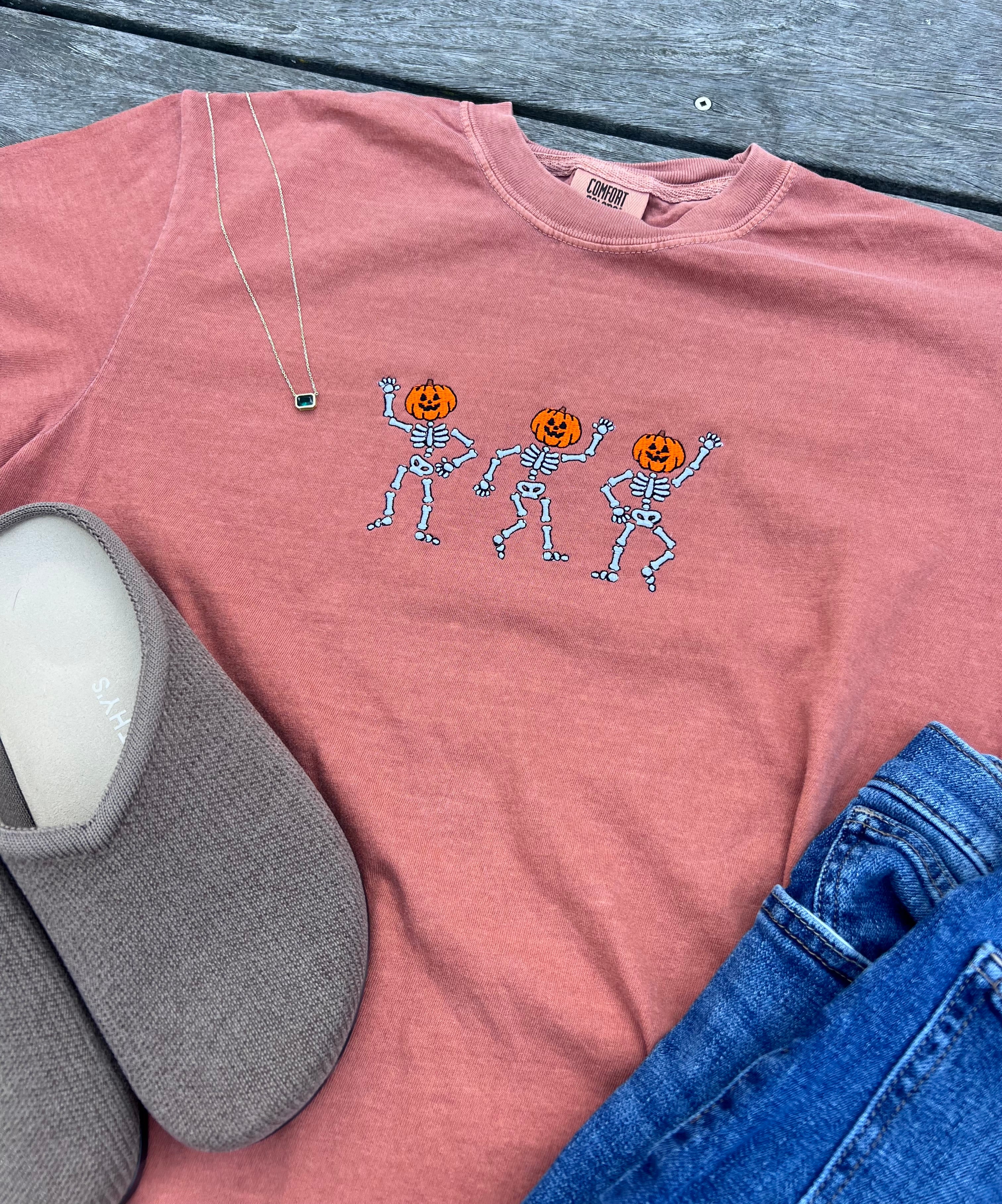 (Copy) Skeletons with Pumpkin Head Embroidered T-Shirt | Spooky Fall Graphic Tee