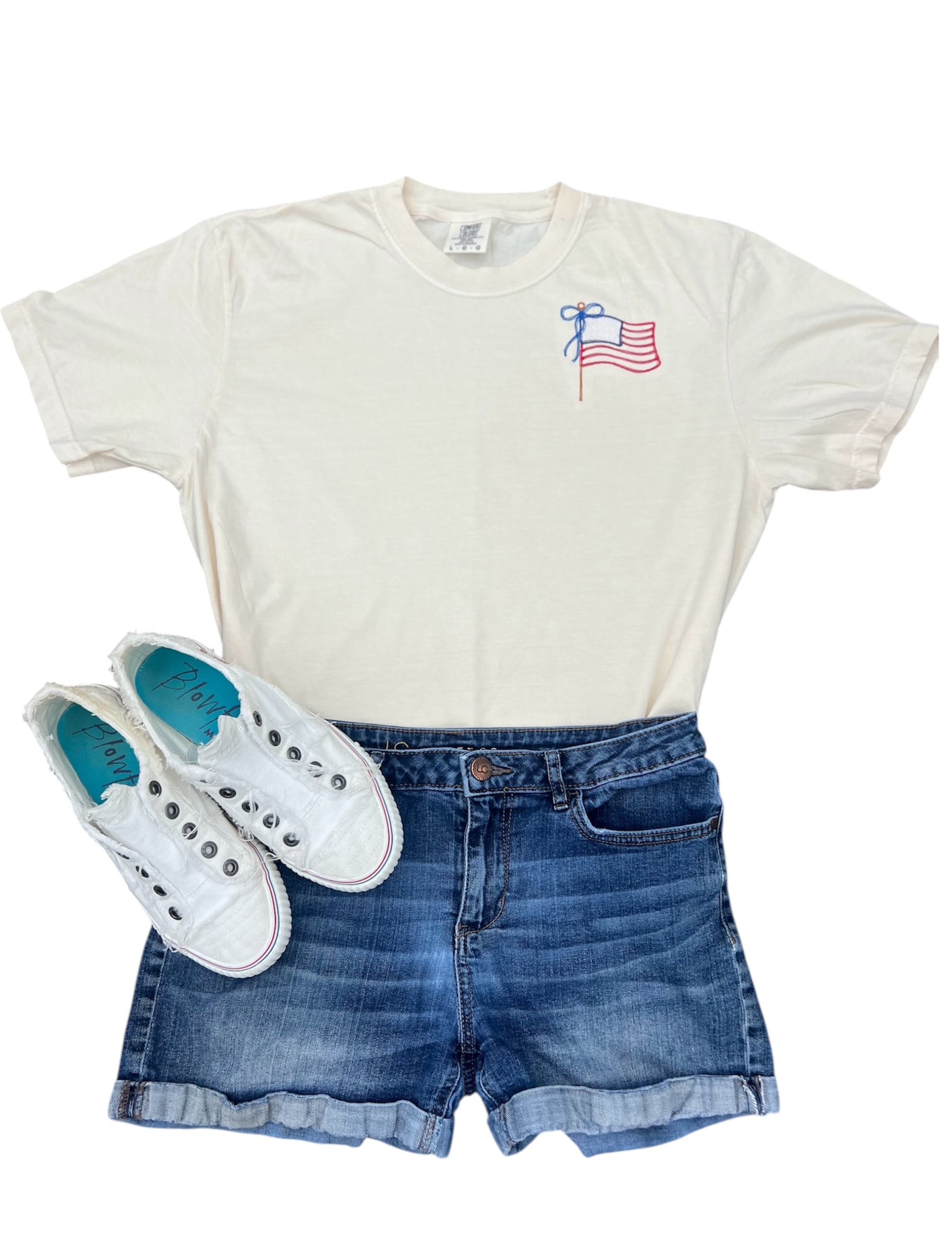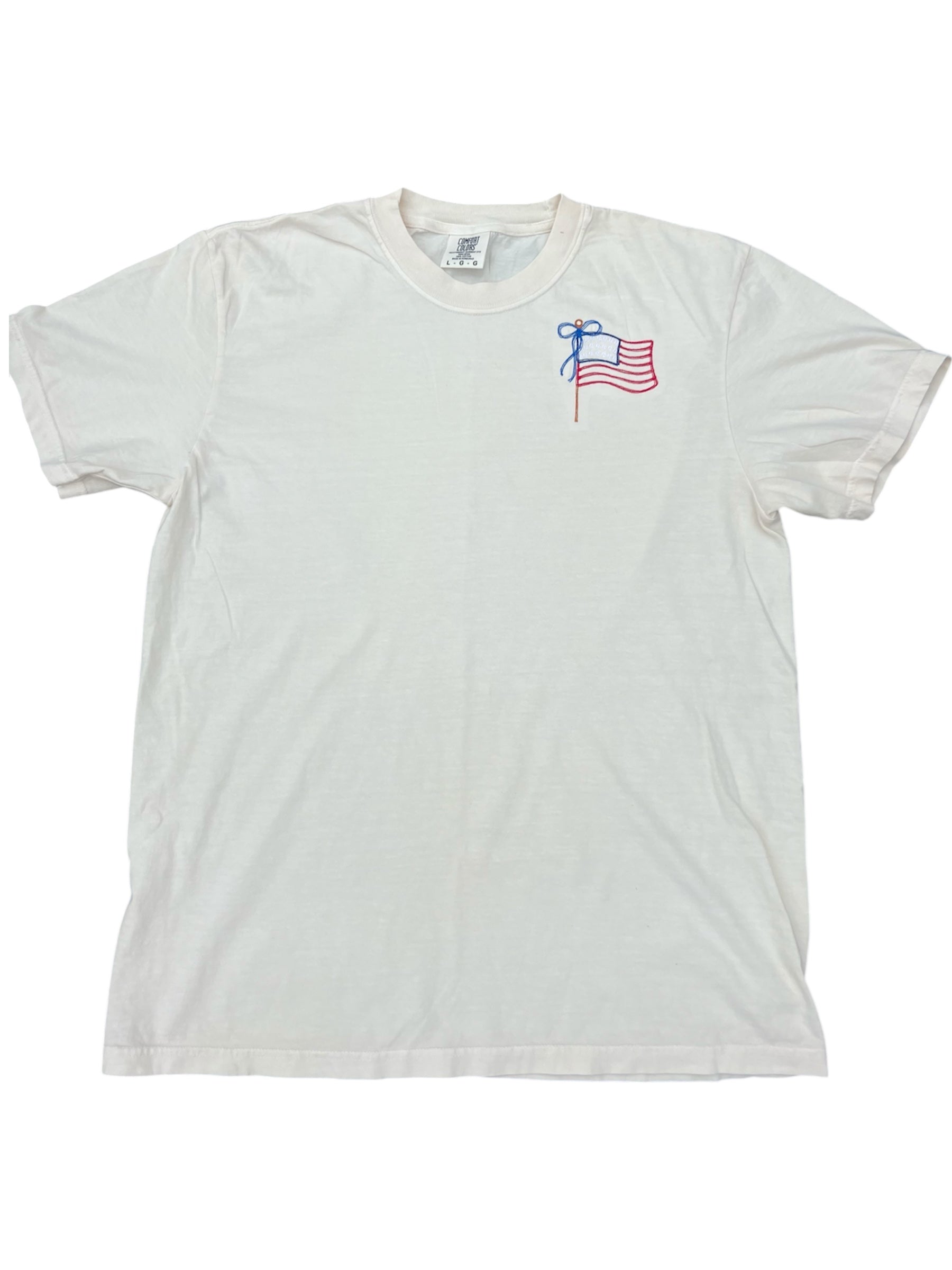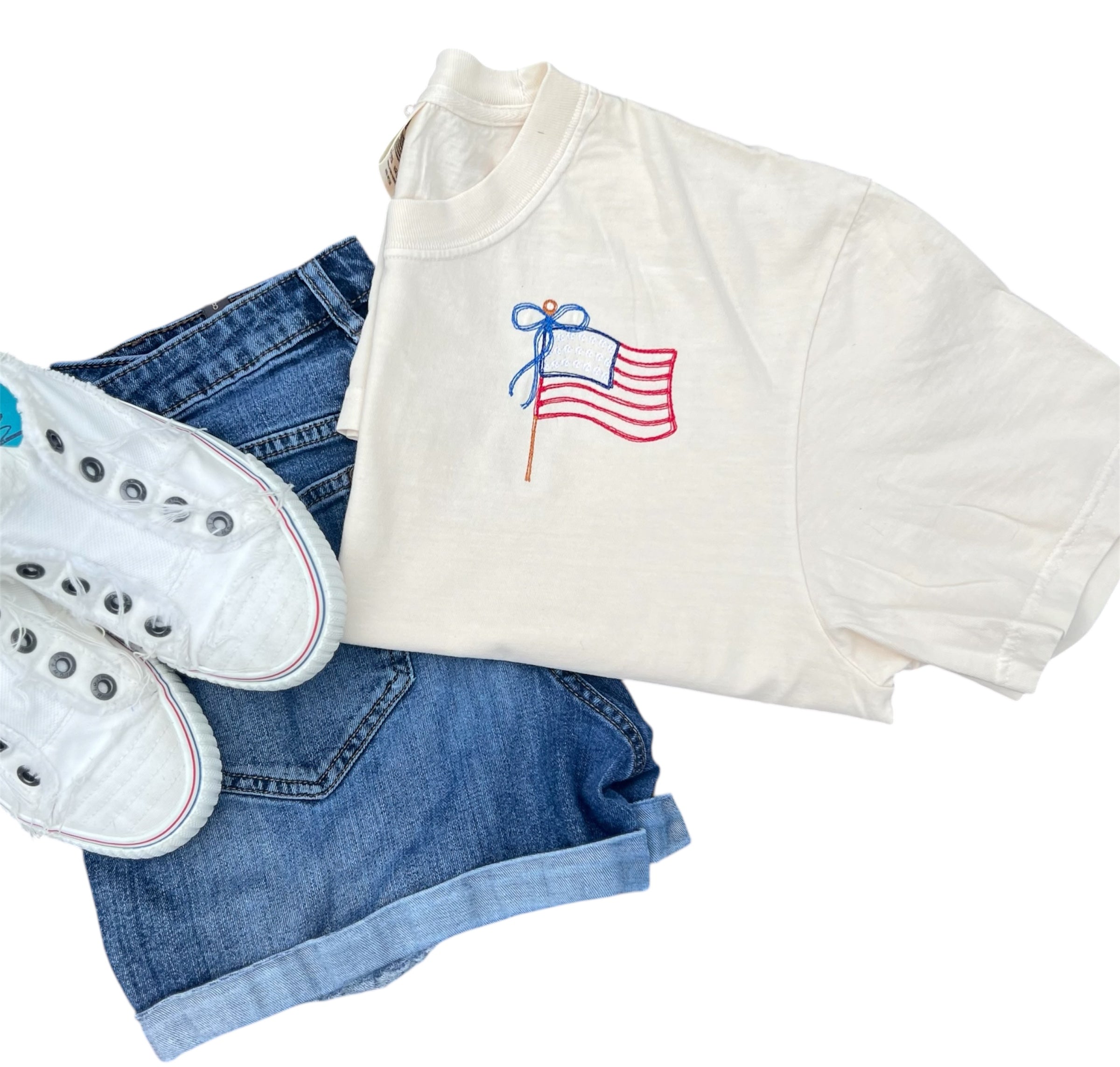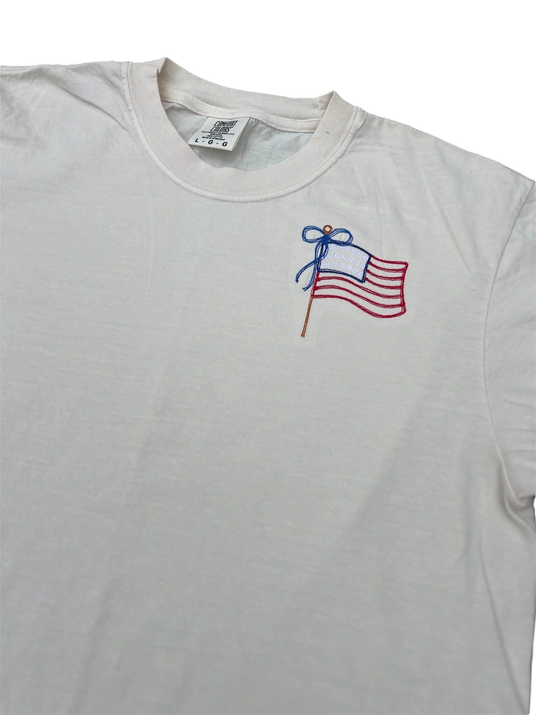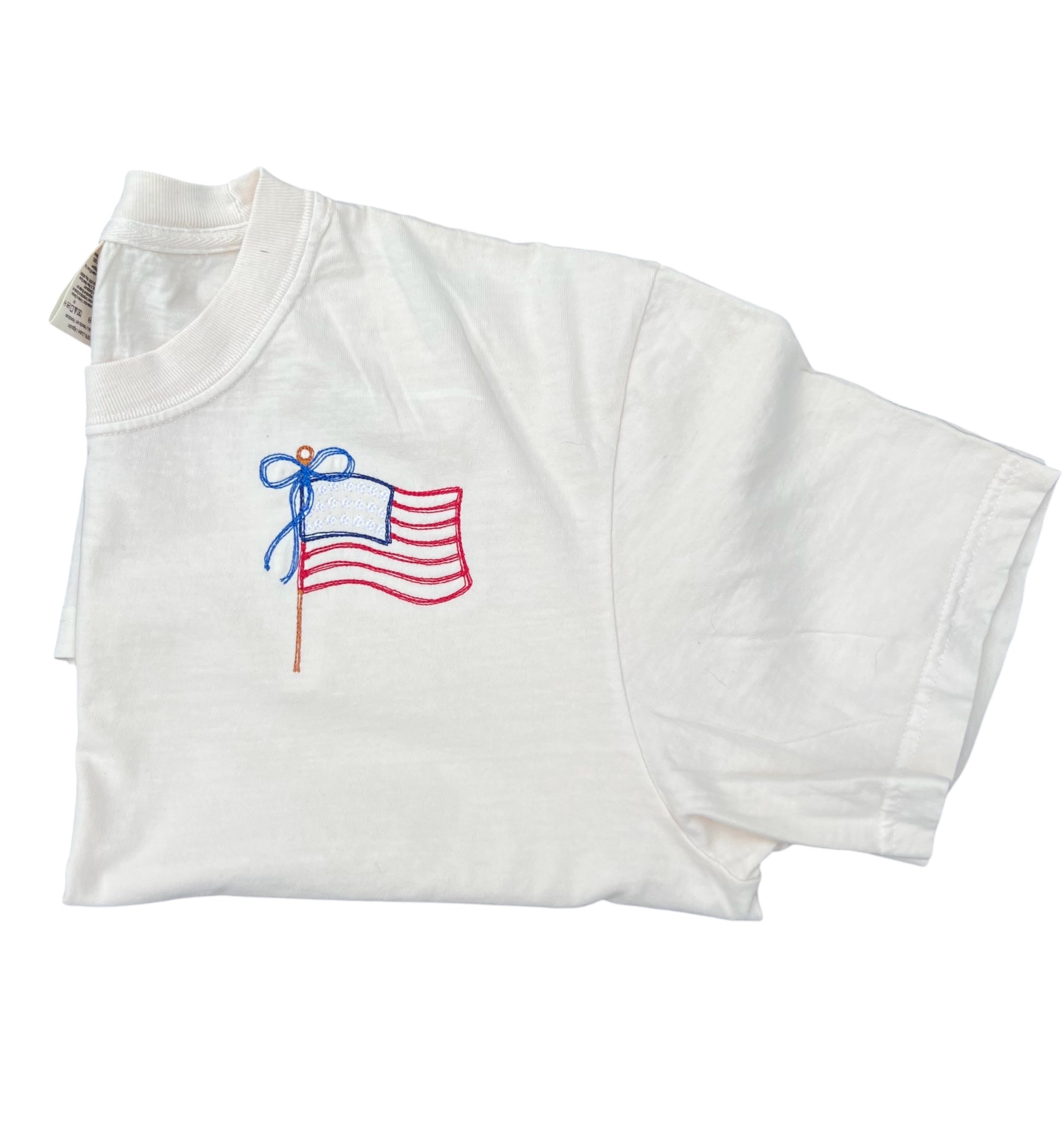 American Flag Coquette Bow Embroidered Shirt – Patriotic & Playful