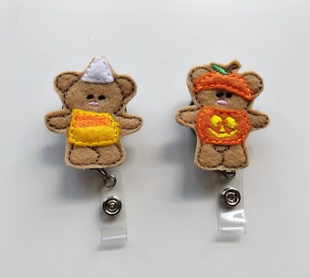 Bear in Pumpkin & Candy Corn Costume Badge Reel