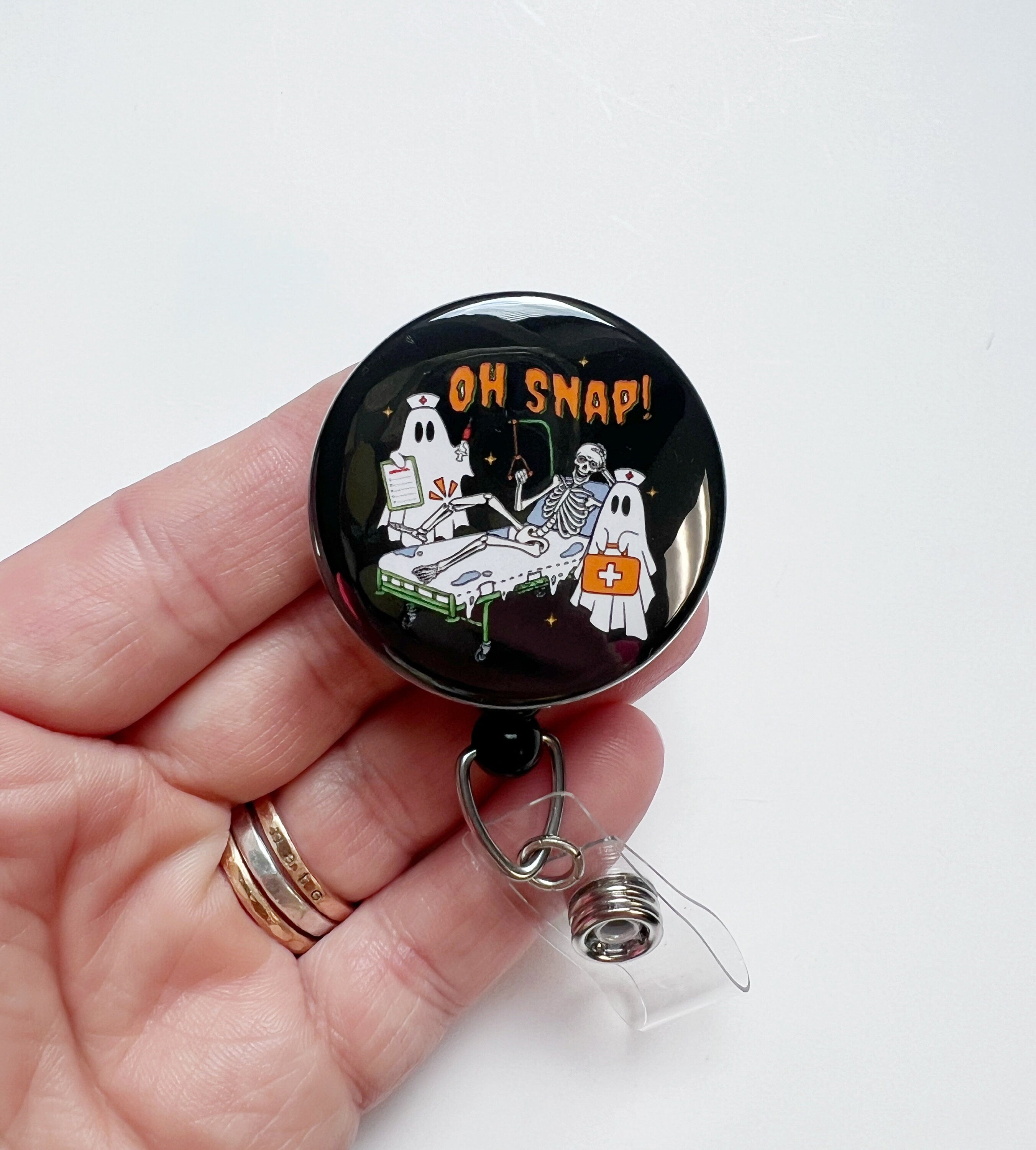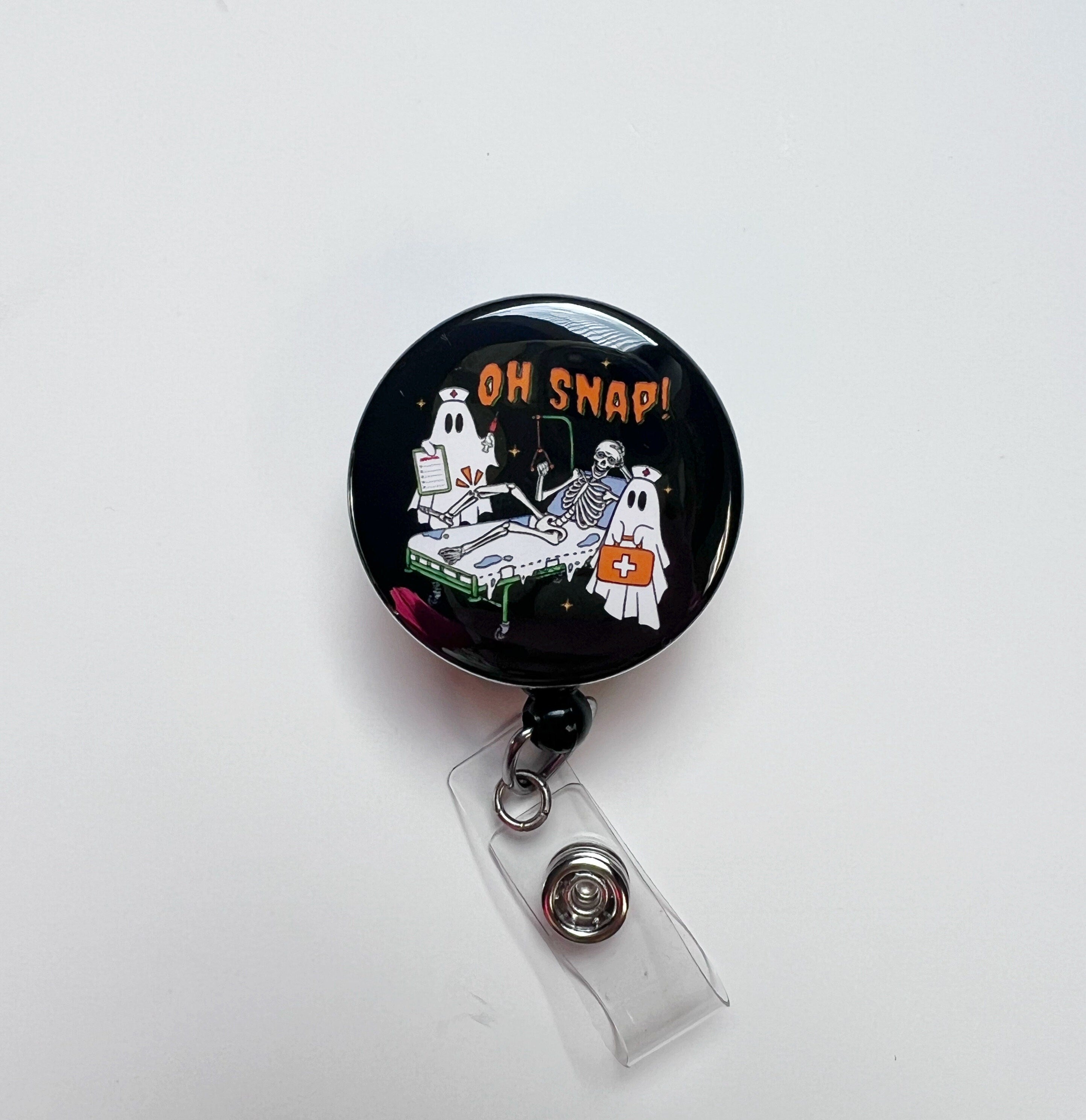 "Oh Snap!" Skeleton Badge Reel – Funny Broken Bone Halloween ID Holder