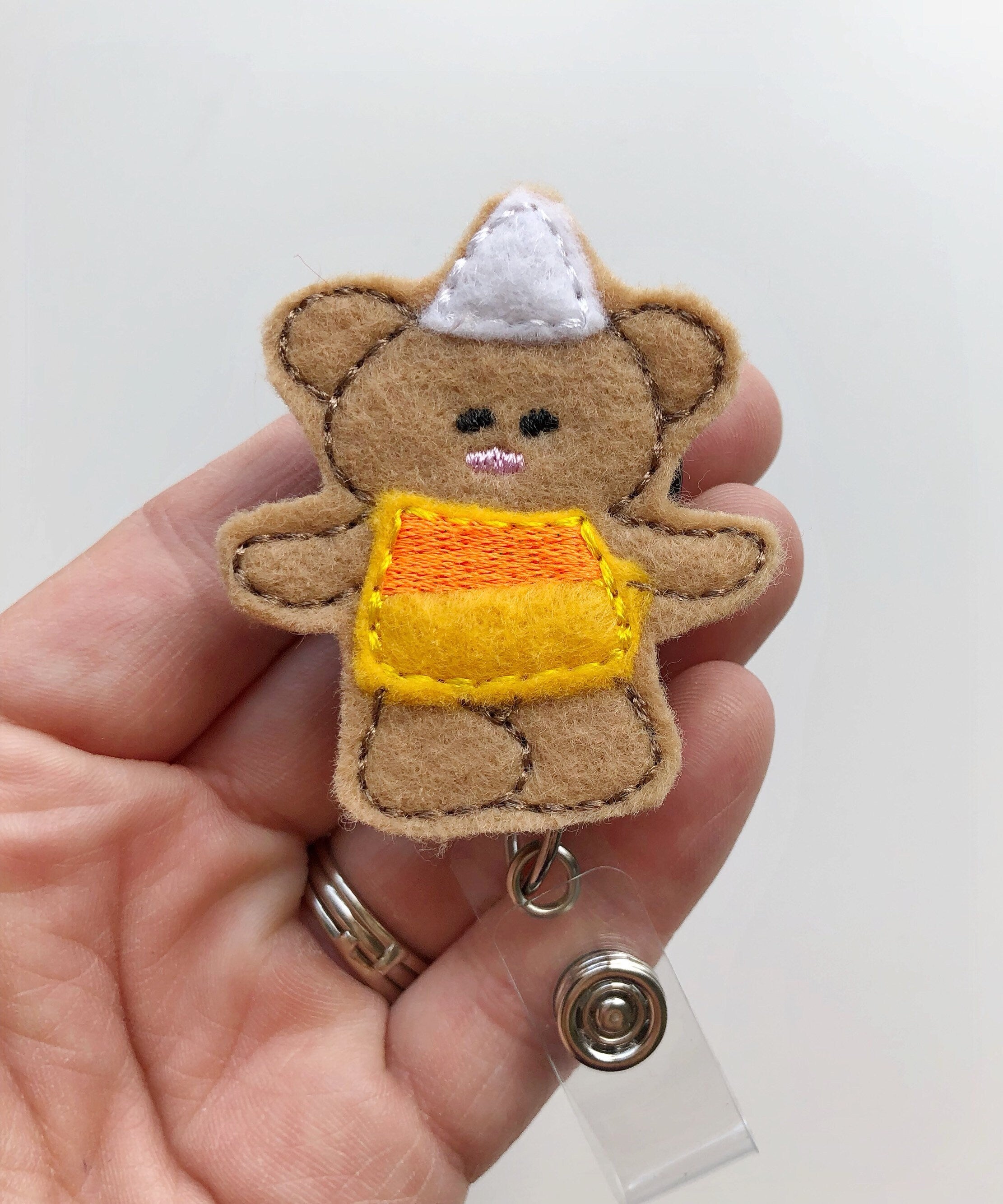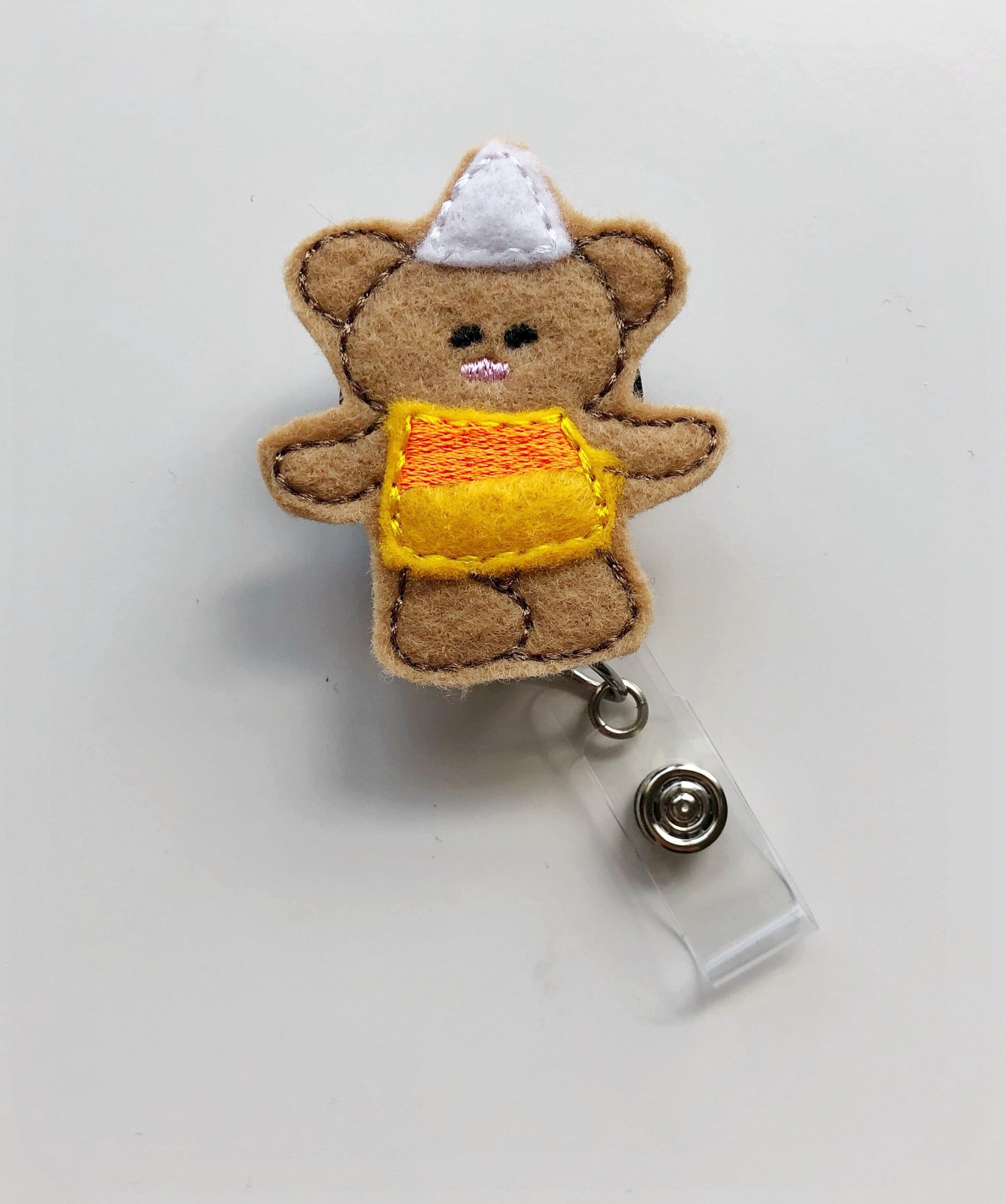 Bear in Candy Corn Costume Badge Reel – Cute Halloween ID Holder for Nurses, Teachers & Halloween Lovers