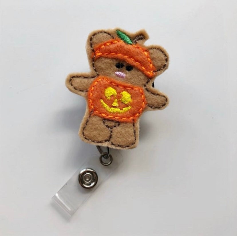 Bear in Pumpkin Costume Badge Reel – Cute Halloween ID Holder for Nurses, Teachers & Halloween Lovers