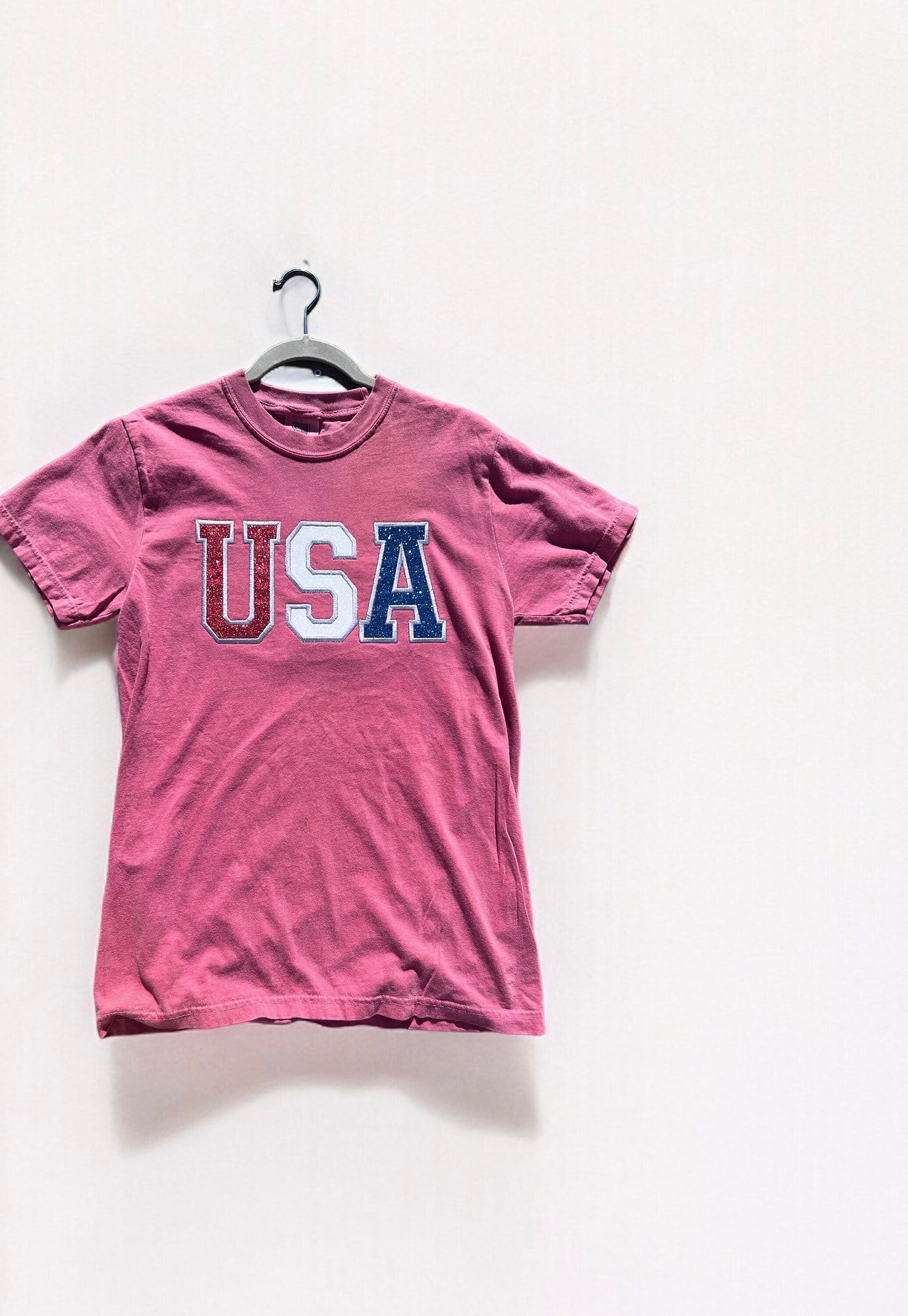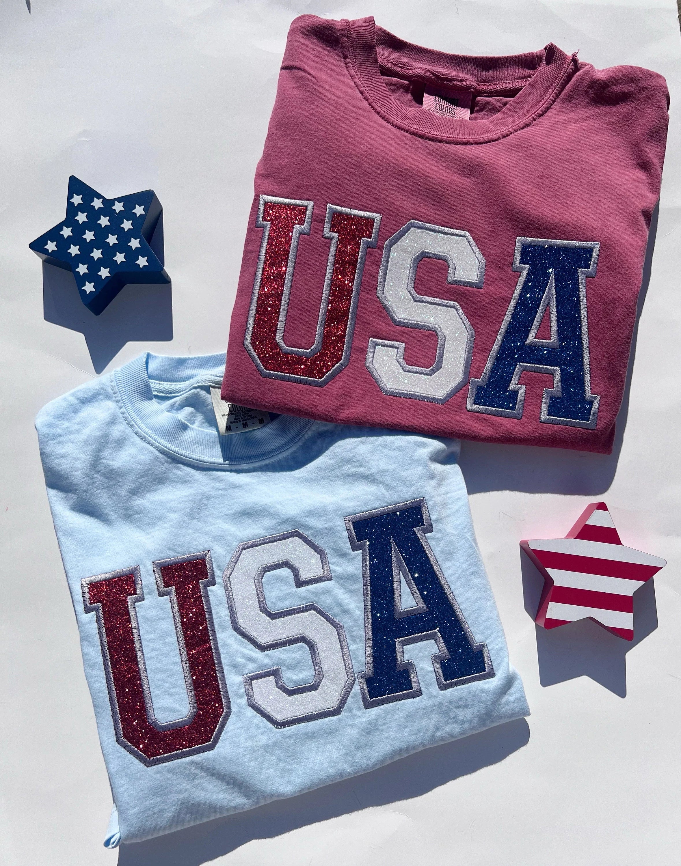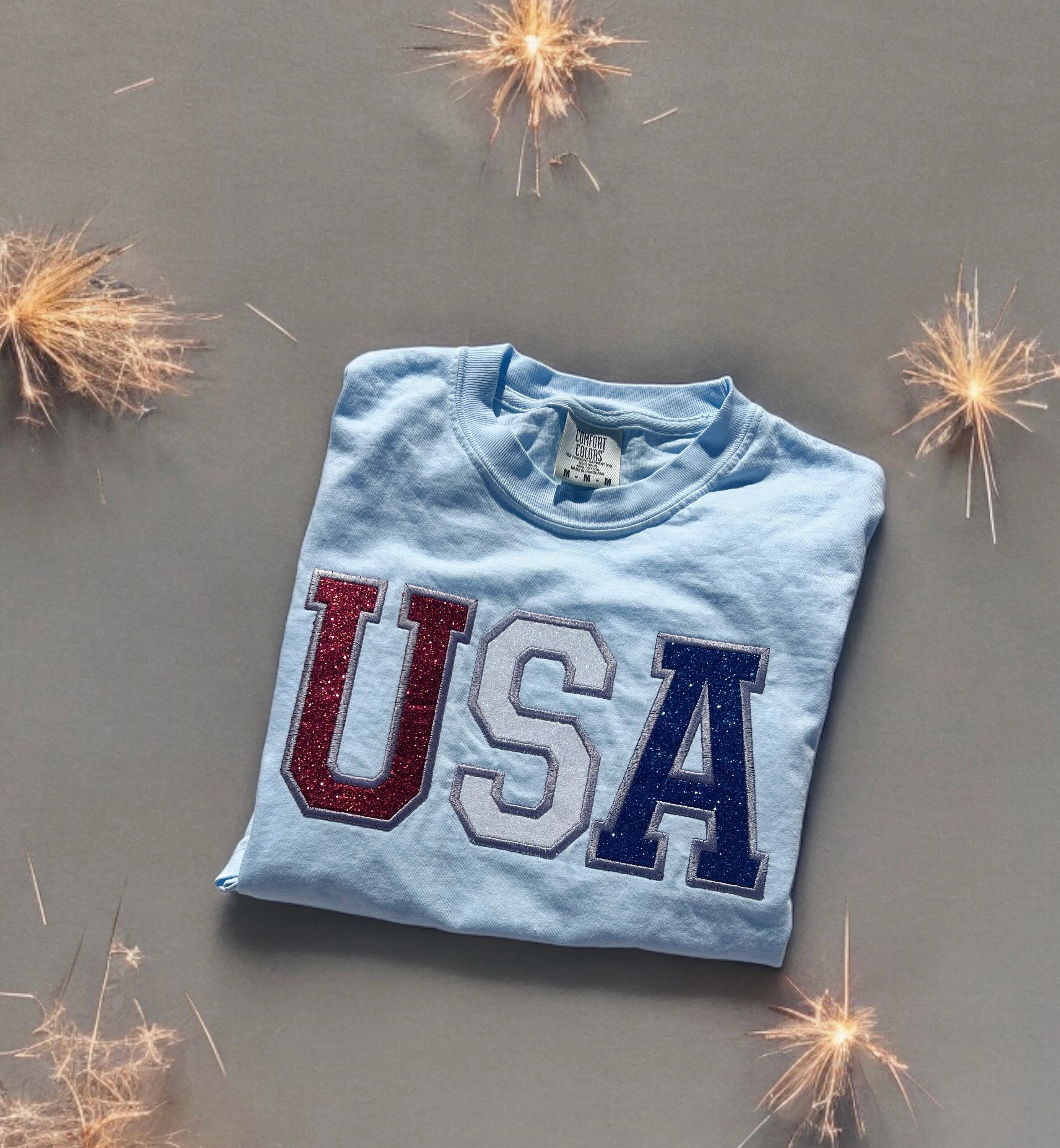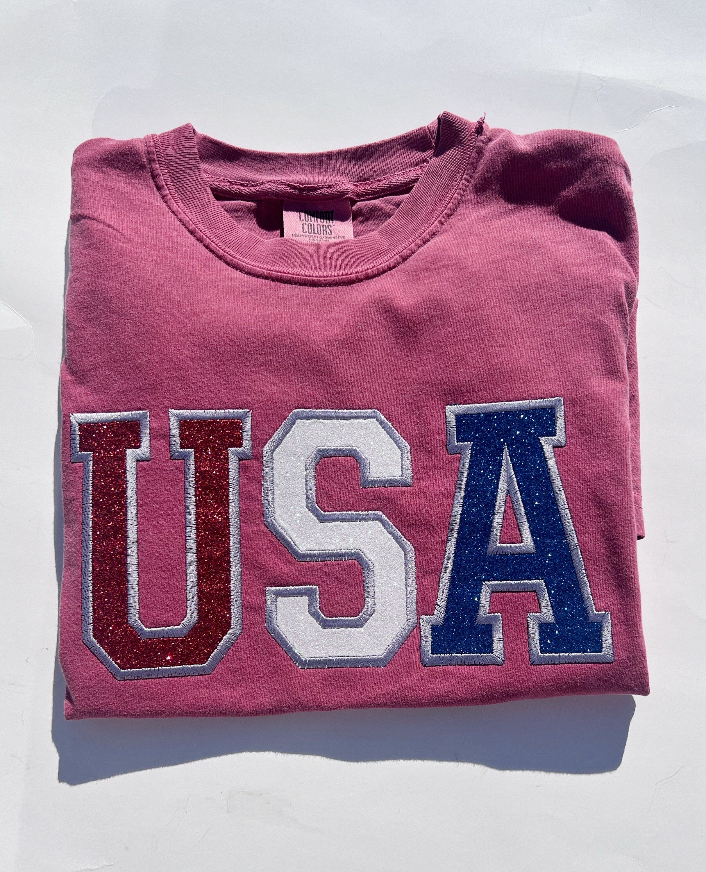 USA Embroidered T-Shirt with Red Bow – Patriotic & Playful