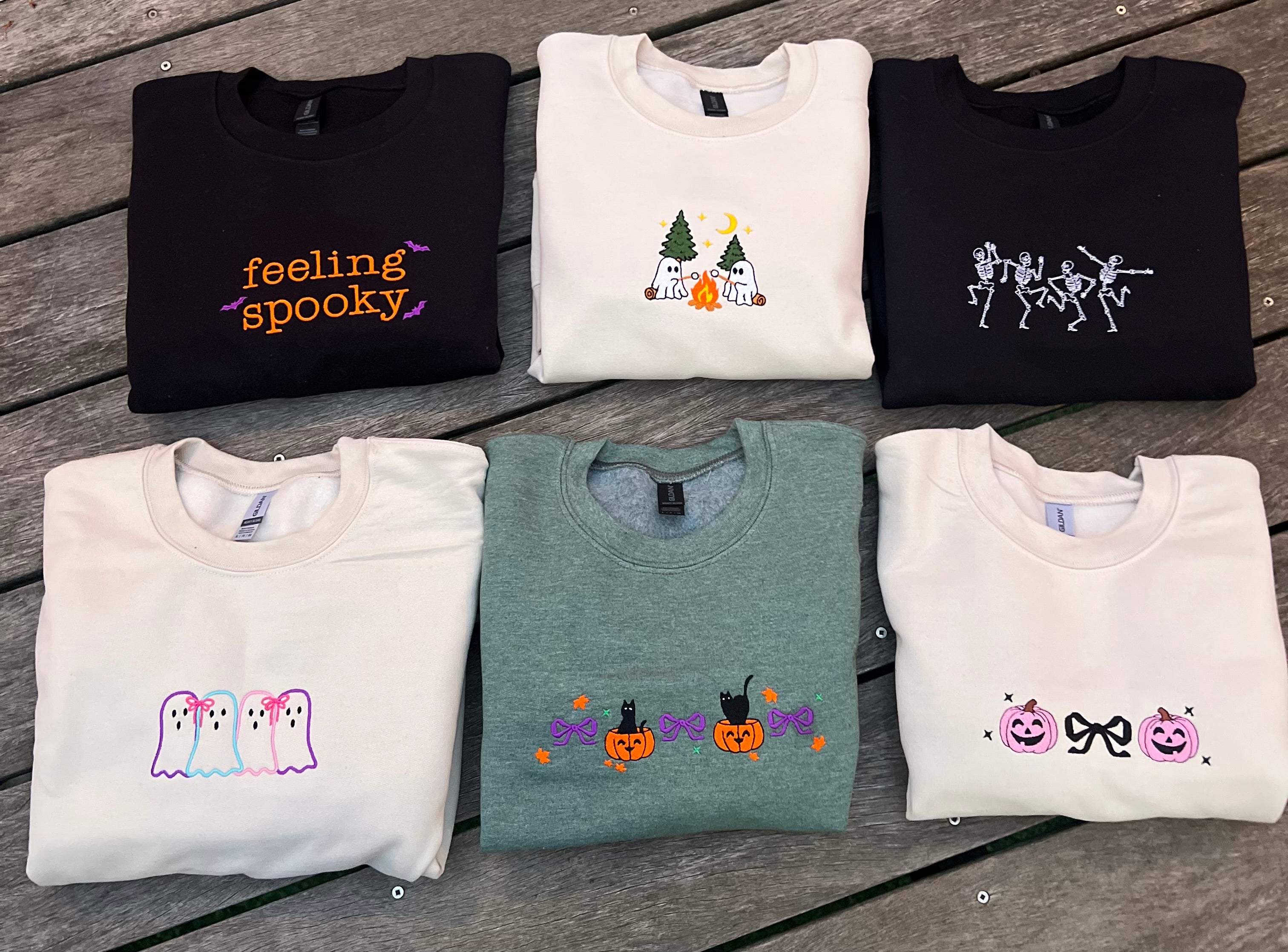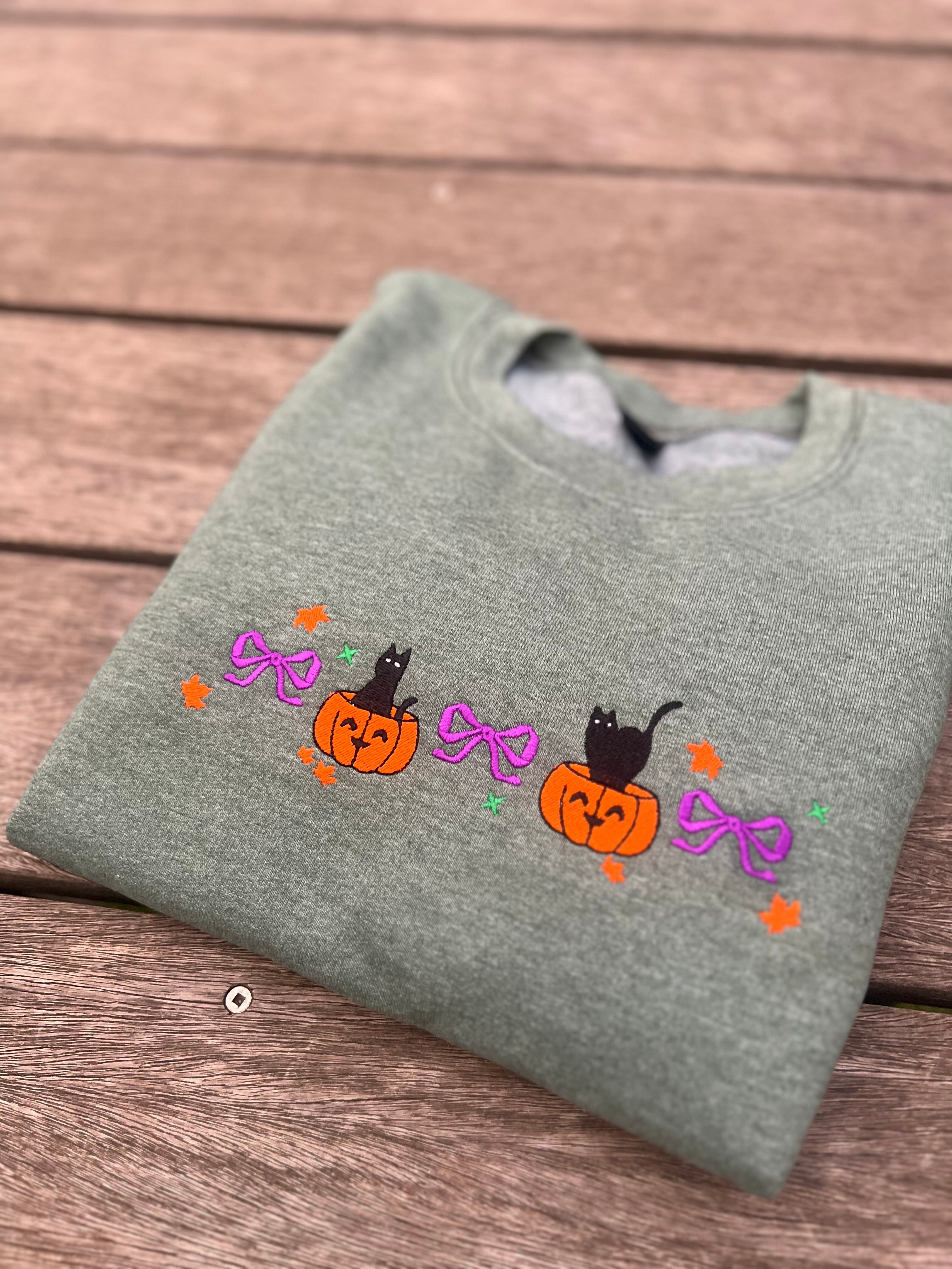 Cat on Pumpkins with Bows Embroidered Sweatshirt – Cute Fall Halloween Crewneck