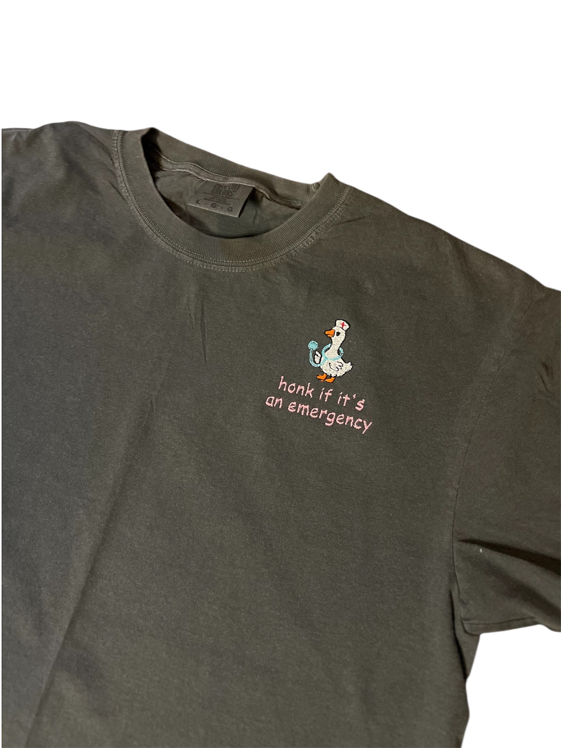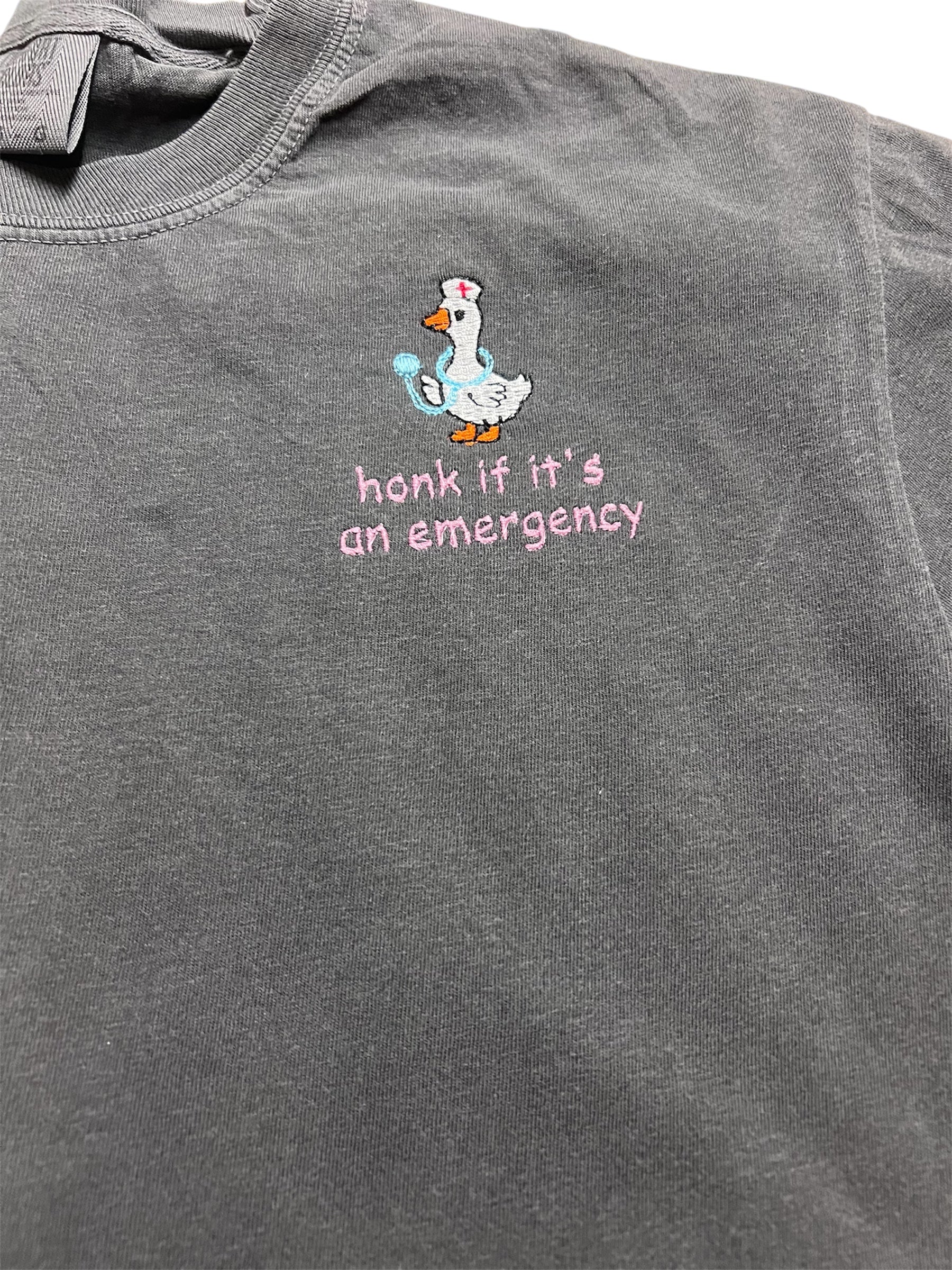 Featuring a heroic goose in a nurse hat and honk if it's an emergency text. This shirt makes a perfect gift or workwear statement piece. It's comfy, durable, and guaranteed to make your coworkers do a double take.