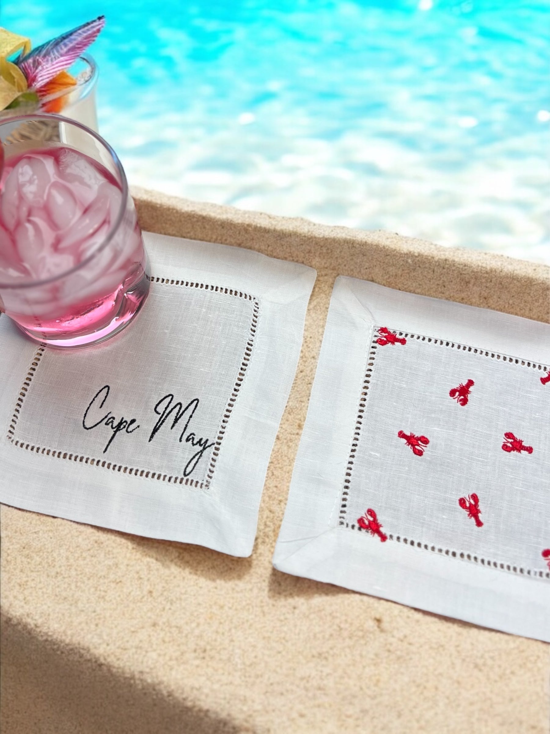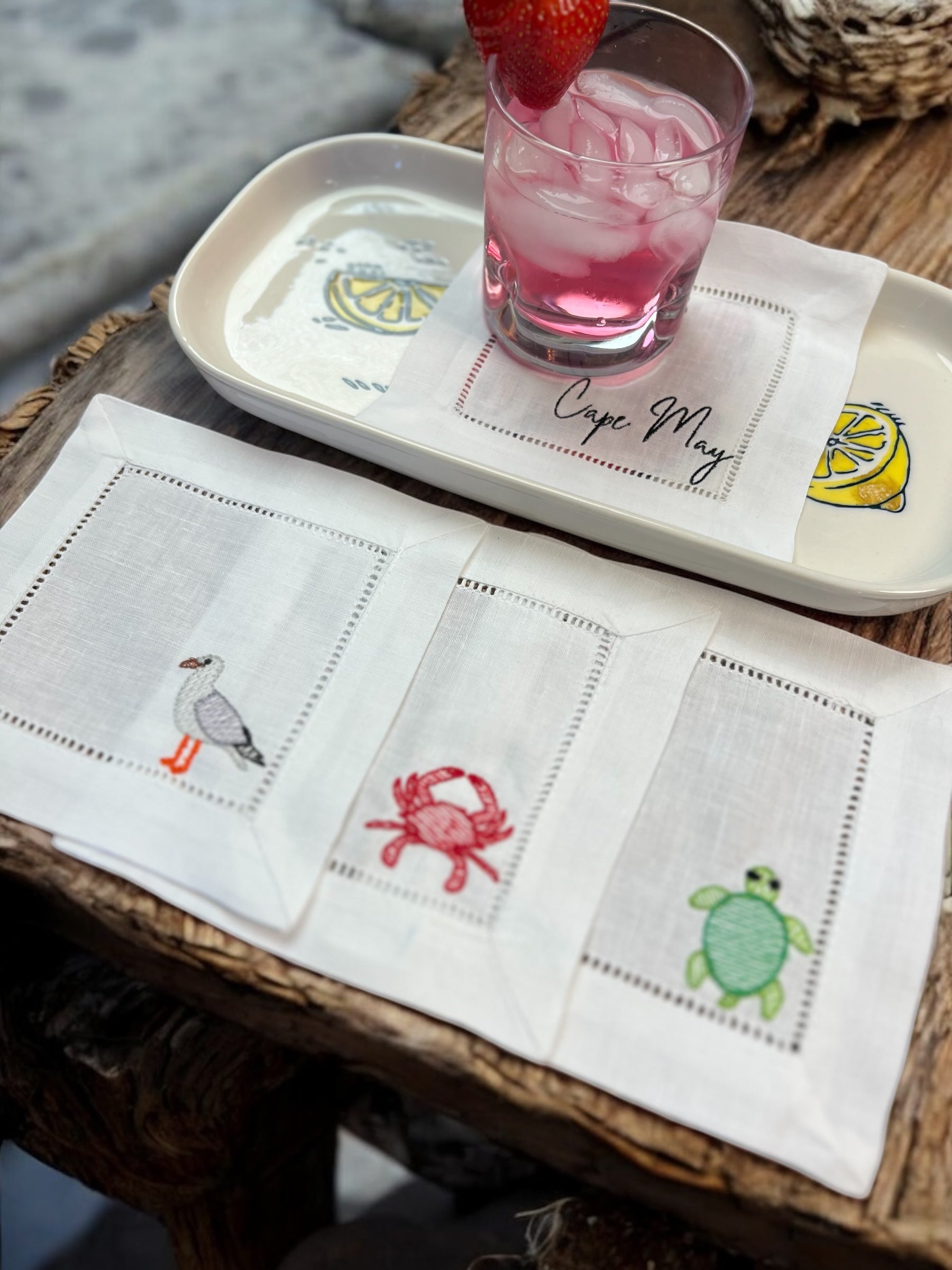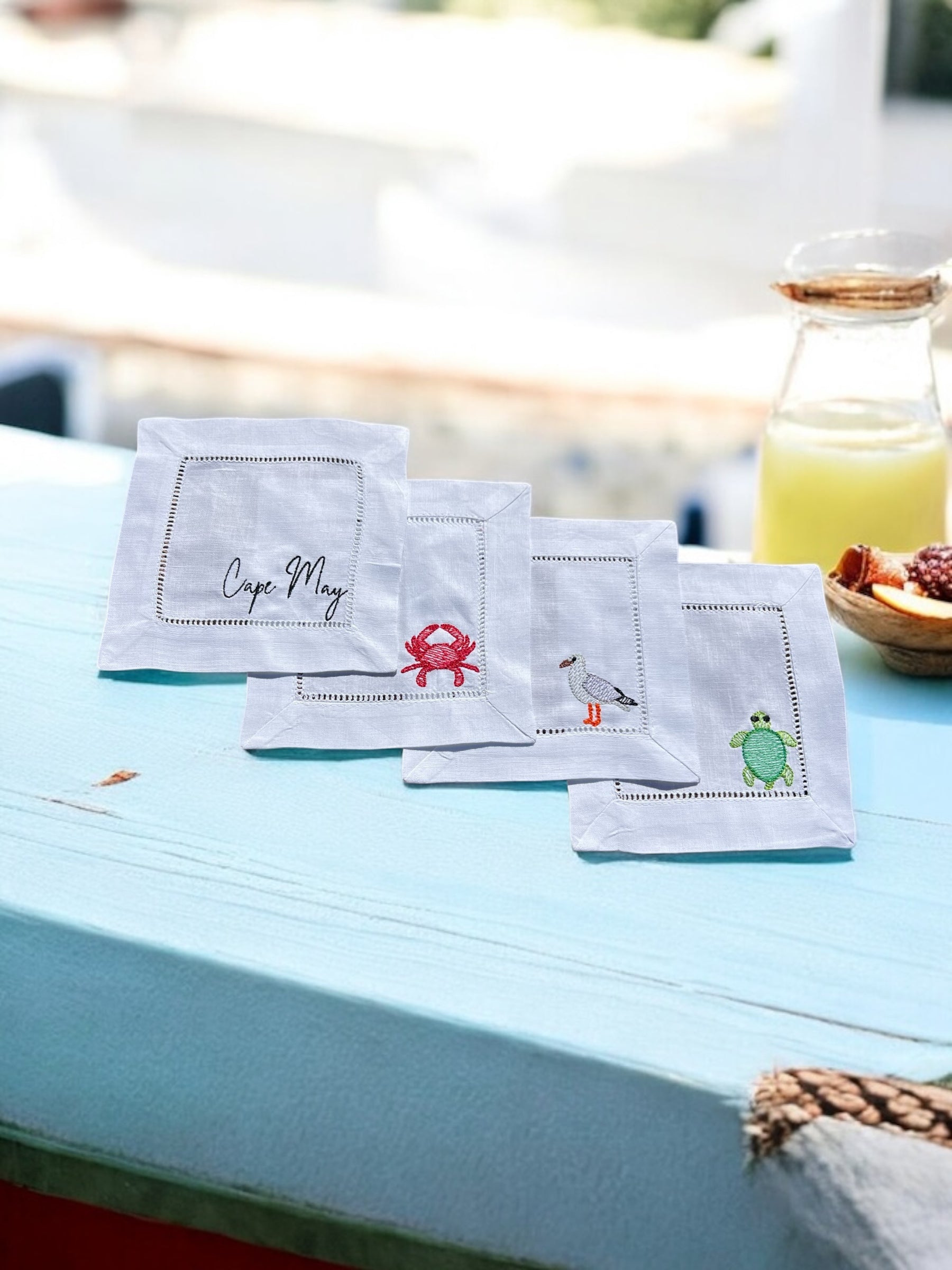 Bring the relaxed vibes of the coast to your next gathering with my embroidered Cocktail Napkins featuring stunning beach-inspired designs. Each napkin is beautifully crafted from linen high-quality fabric and adorned with embroidery designs showcasing scenes of seagulls, sea turtles, crabs, and a custom beach town.