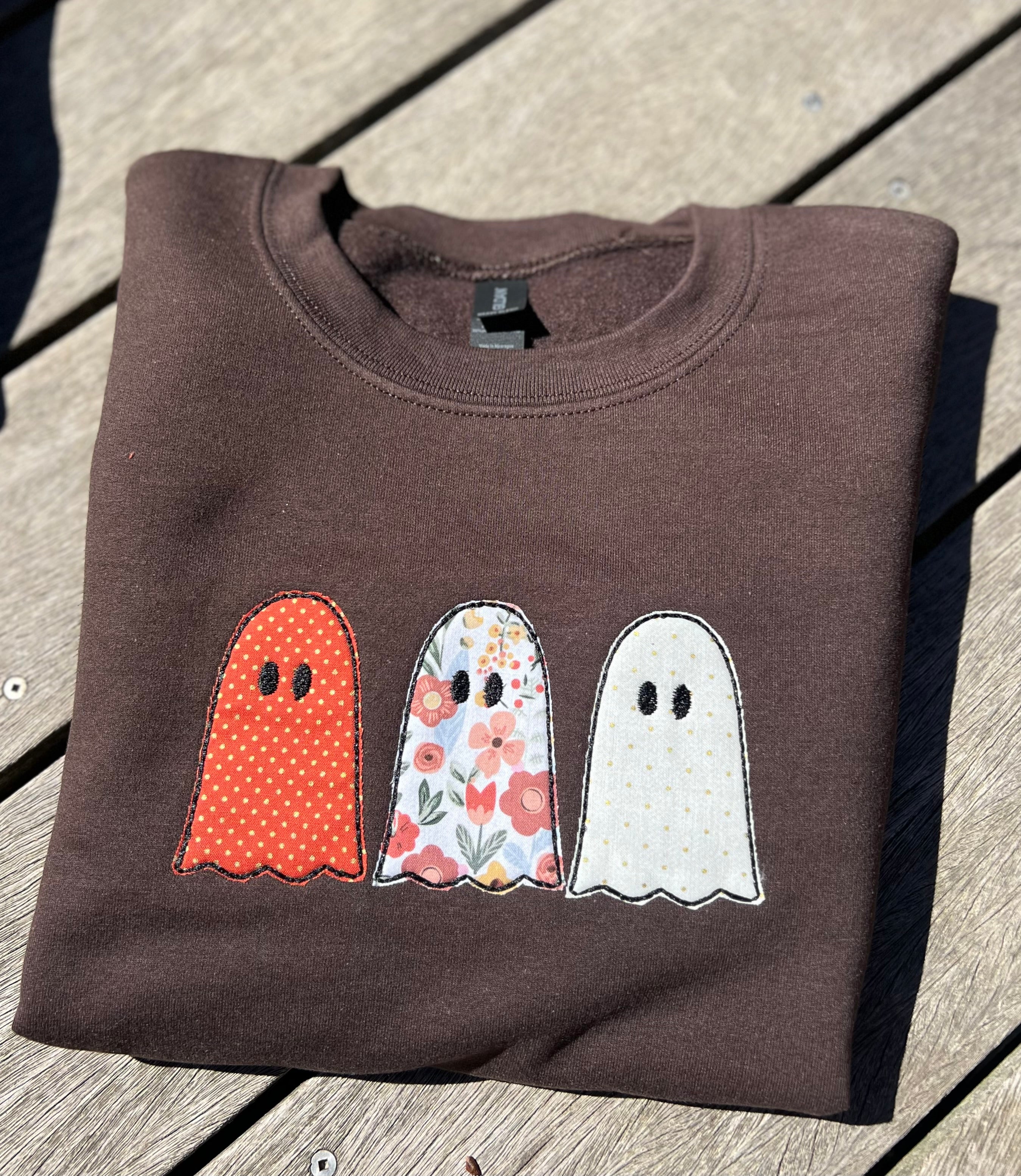 Ghost with Fabric Appliqué Embroidered Sweatshirt – Cozy Fall & Halloween Crewneck