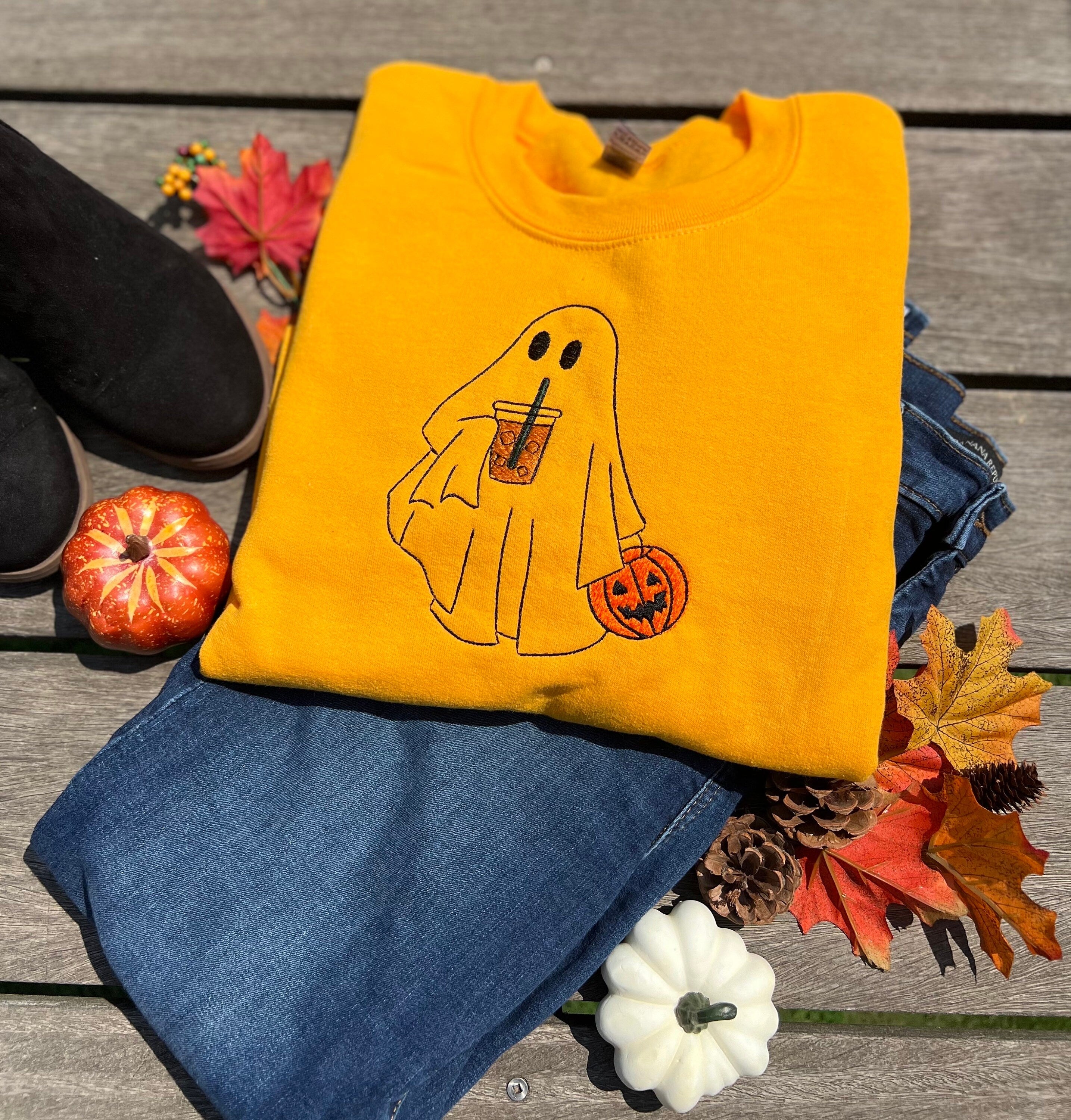 Ghost with Iced Coffee Sweatshirt – Cute Halloween Pullover for Fall & Coffee Lovers