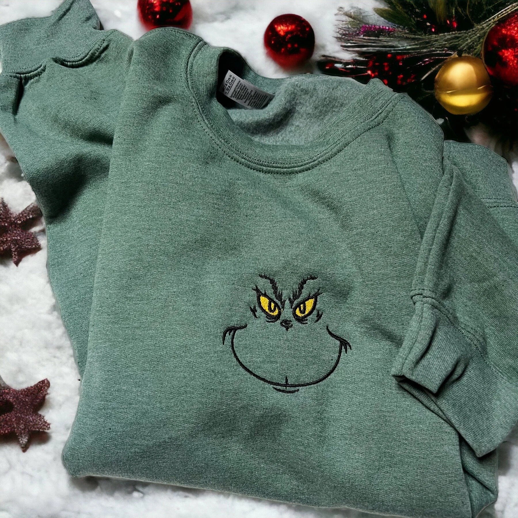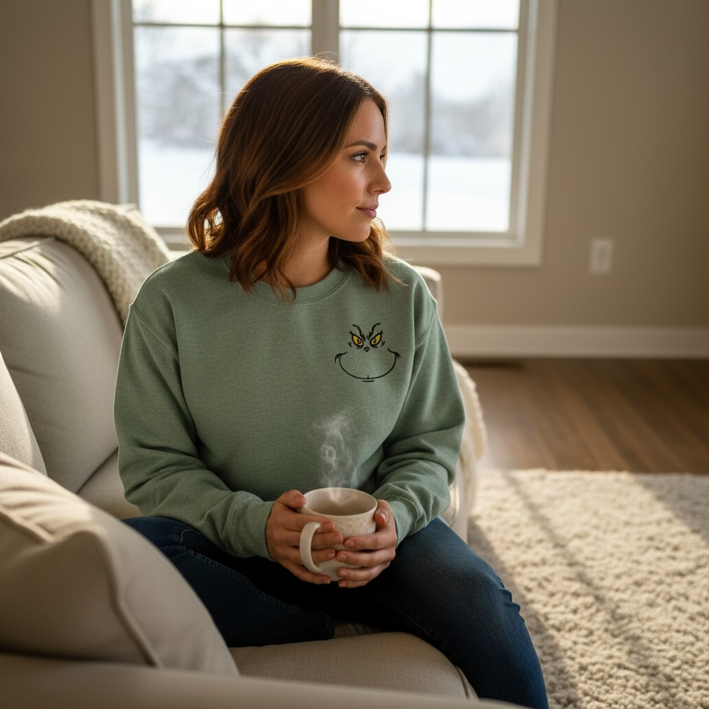 Grumpy Holiday Face Embroidered Sweatshirt (Green Holiday Design)