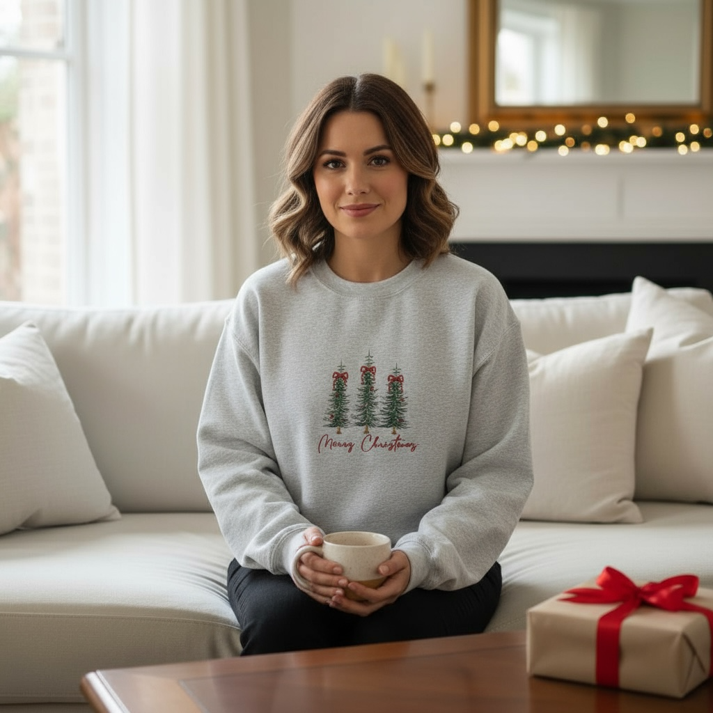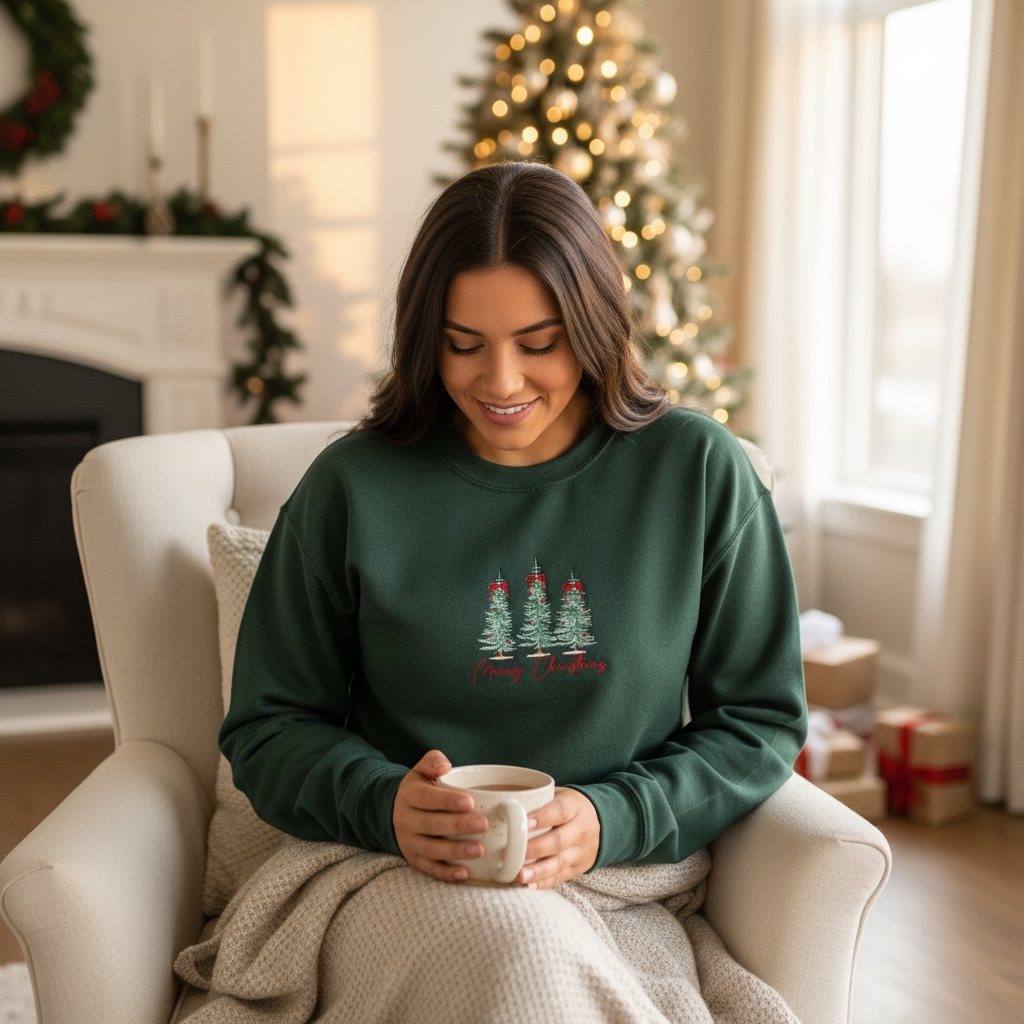 This sweatshirt features a timeless Merry Christmas script paired with simple stitched pine trees for that warm, nostalgic, Hallmark-holiday vibe.