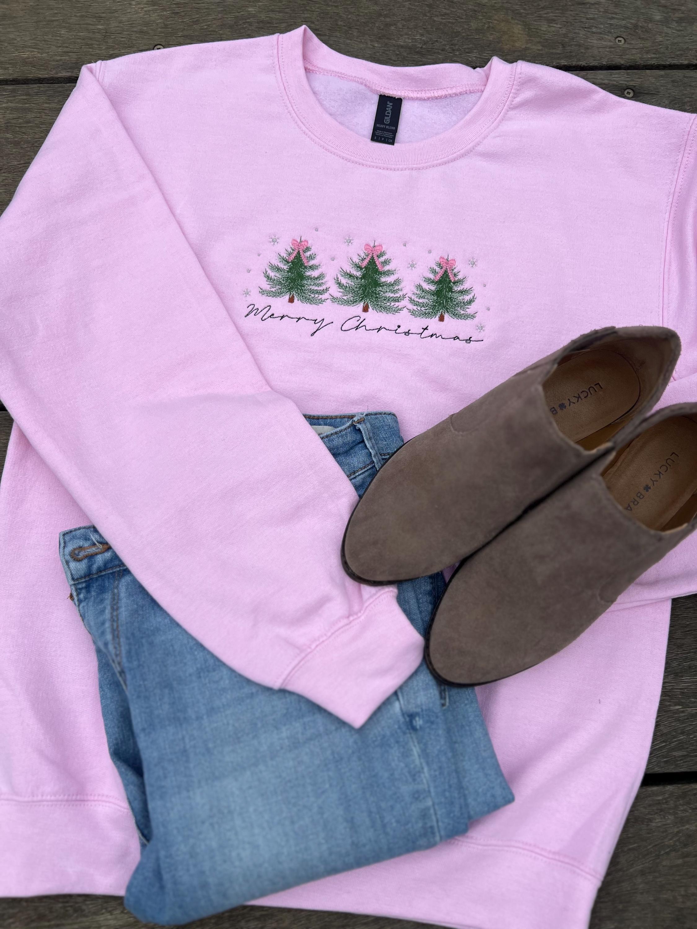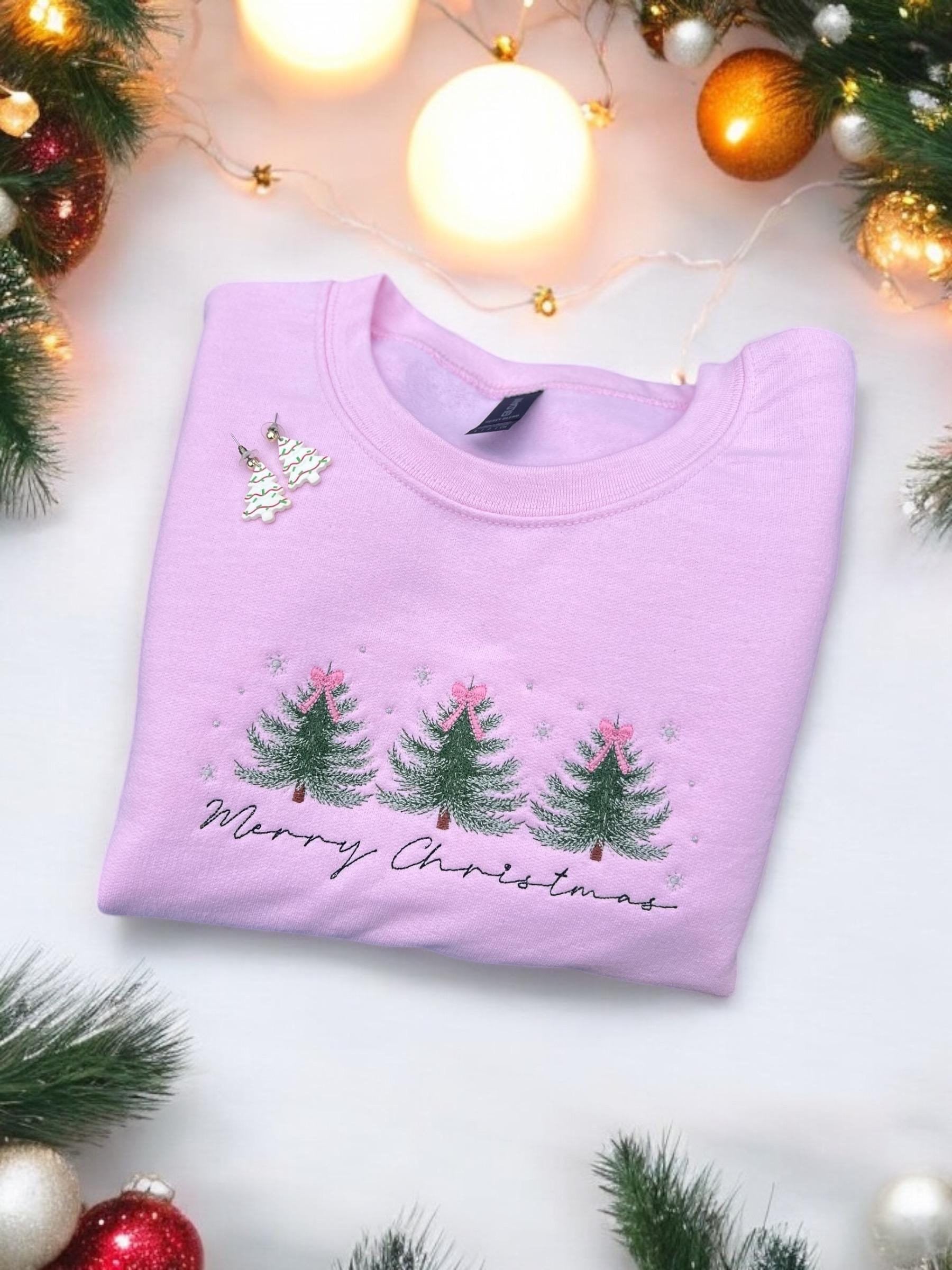 holiday sweatshirt, christmas sweatshirt, merry christmas sweater, embroidered sweater, christmas tree sweatshirt, pink christmas, retro