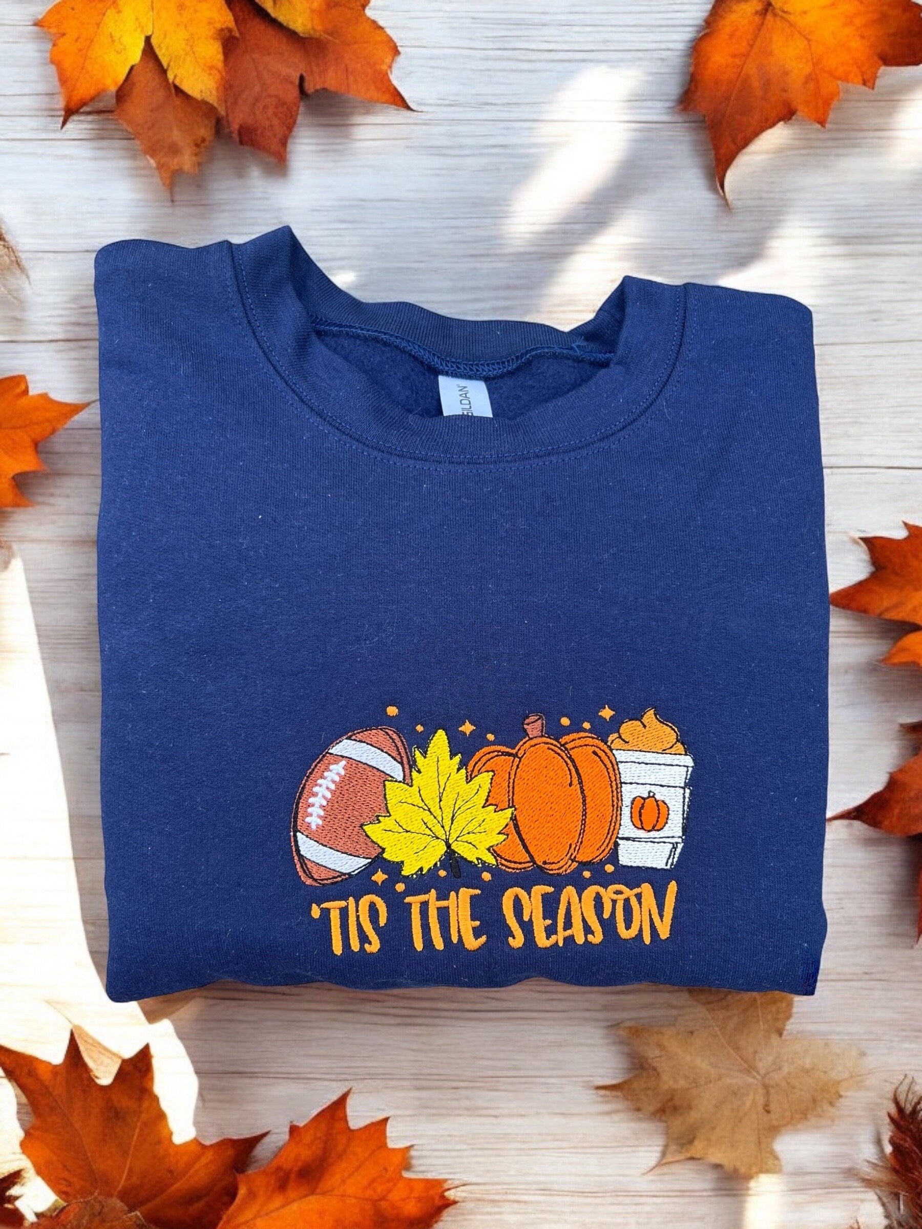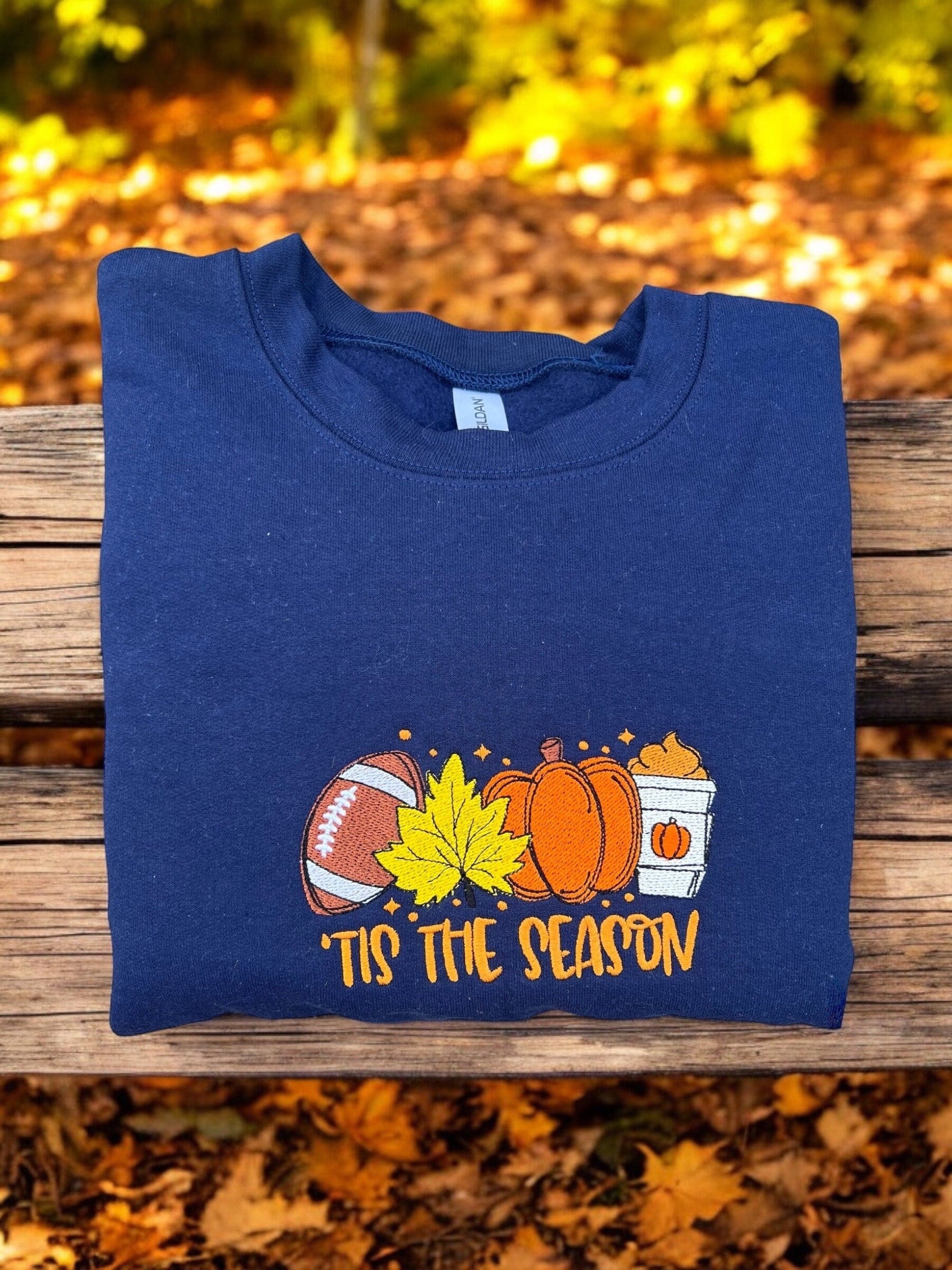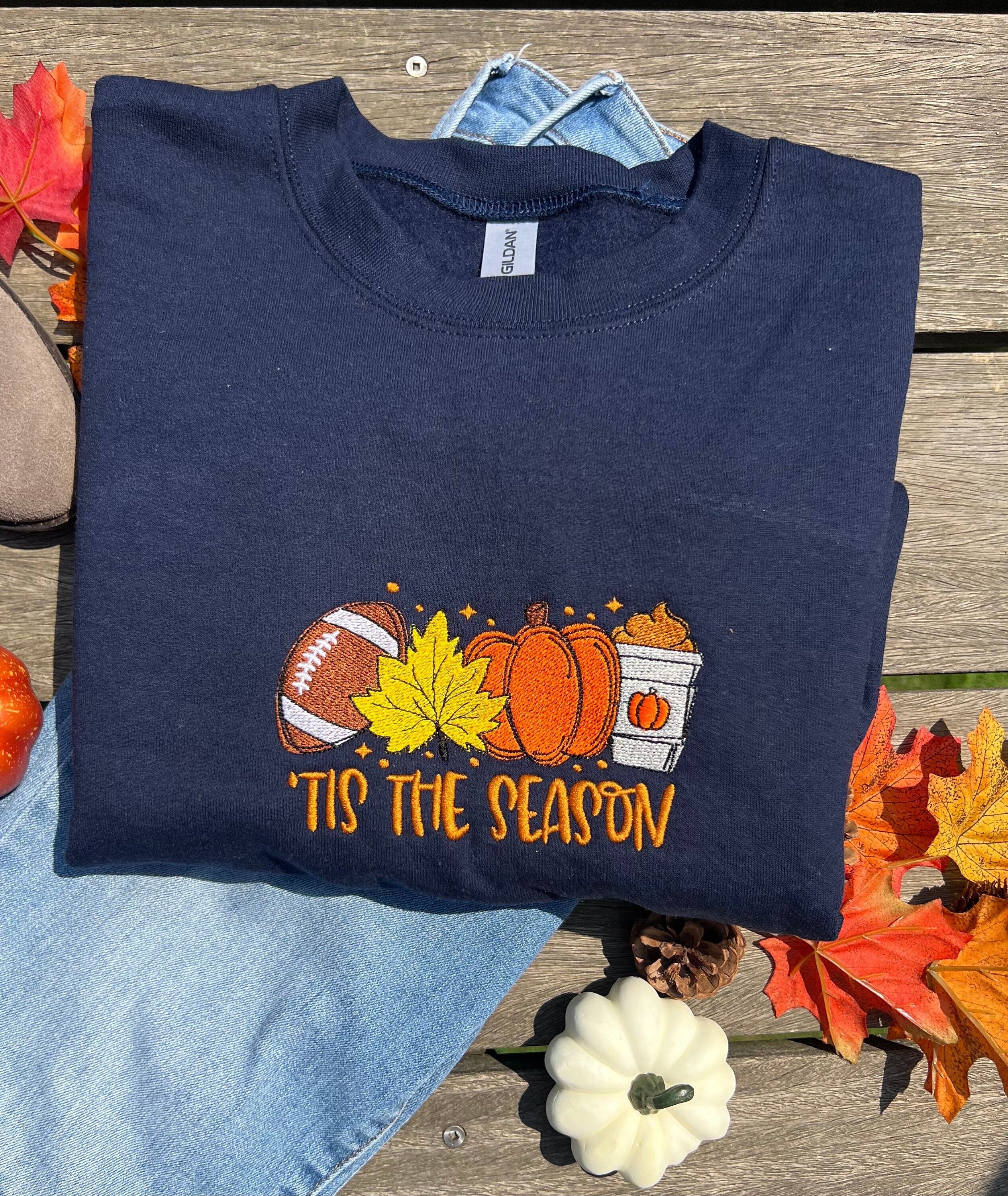 Tis the Season" Embroidered Sweatshirt – Fall Vibes with Football & Pumpkin Spice