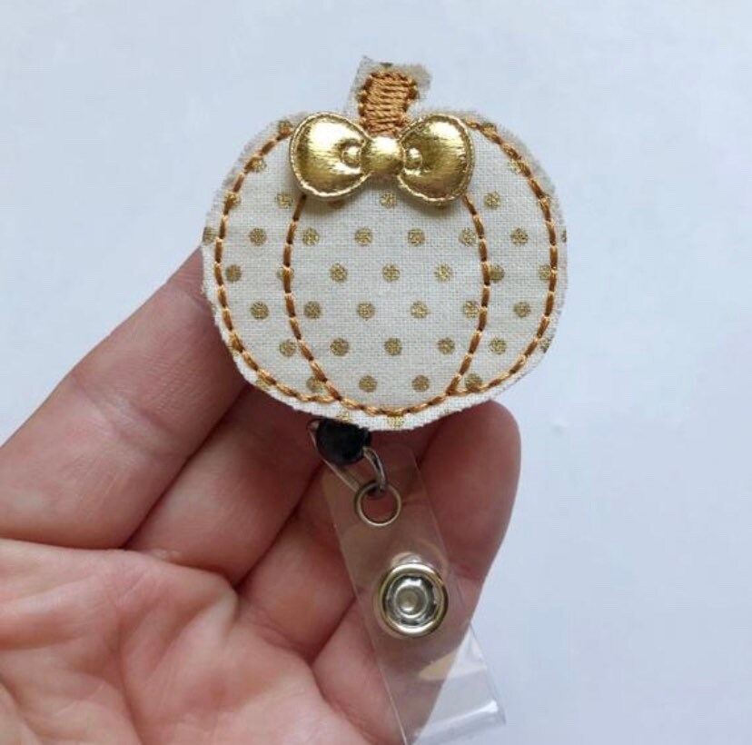 White Pumpkin with Gold Polka Dots Badge Reel – Elegant Fall ID Holder