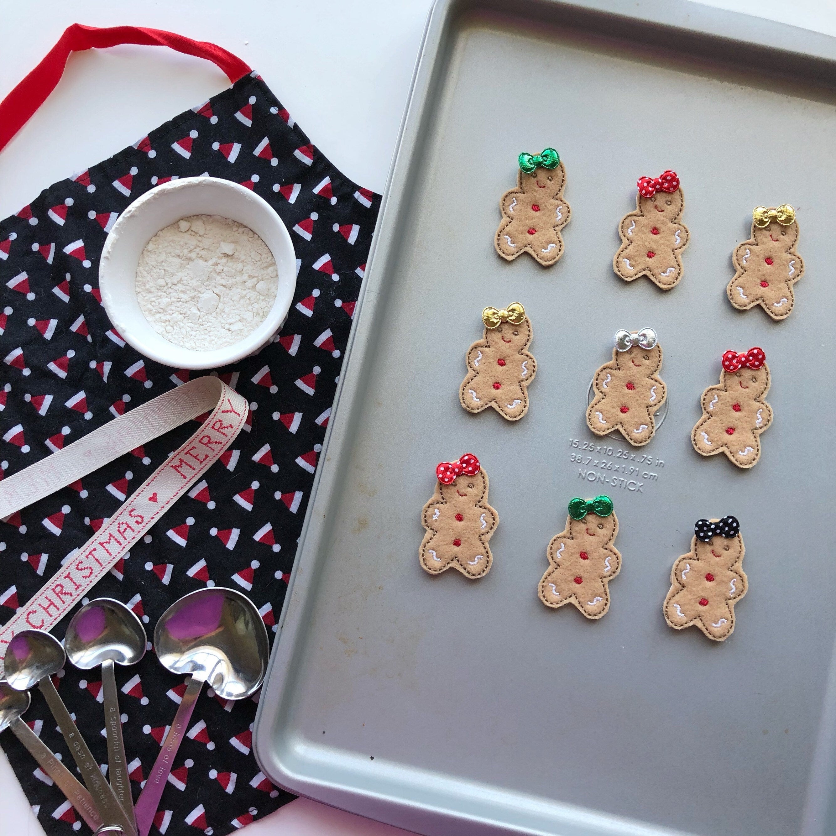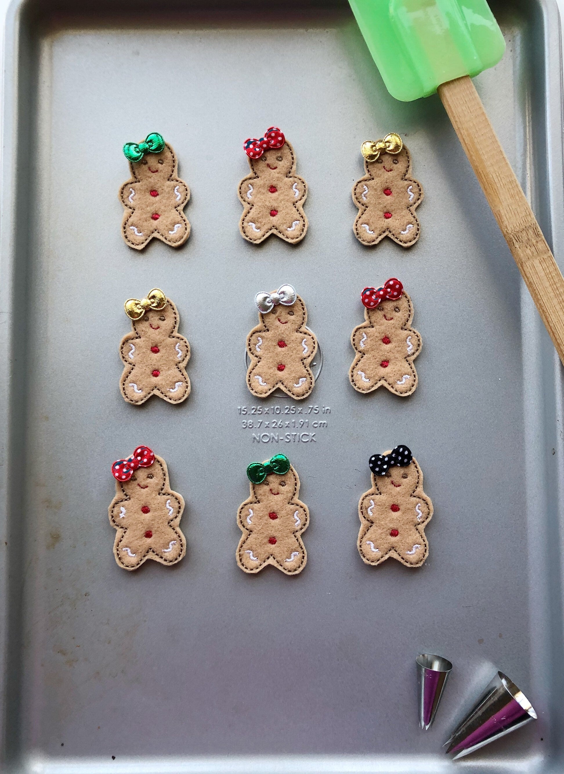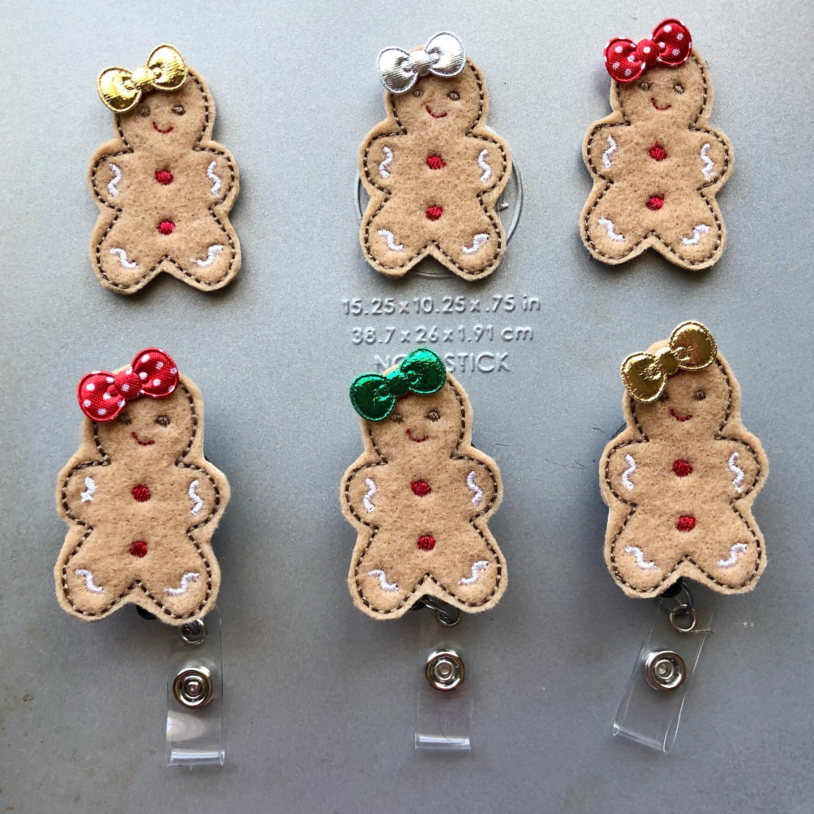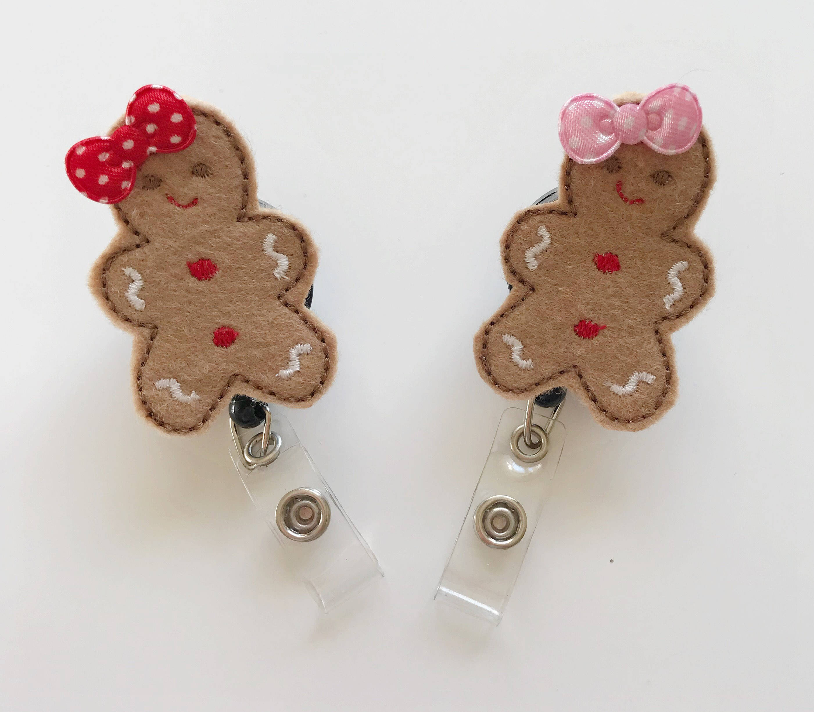 Gingerbread patches are machine embroidered by me and then securely attached to your clip.