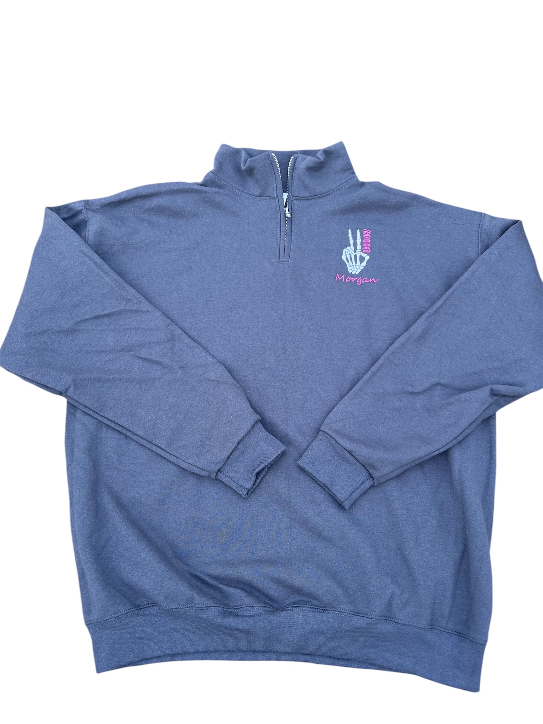 Show off your radiology pride with a chill twist in this custom quarter-zip sweatshirt. Featuring a bold X-ray-style skeleton hand throwing up the peace sign, this cozy pullover is perfect for radiologic technologists, X-ray techs, med students, and healthcare heroes alike.