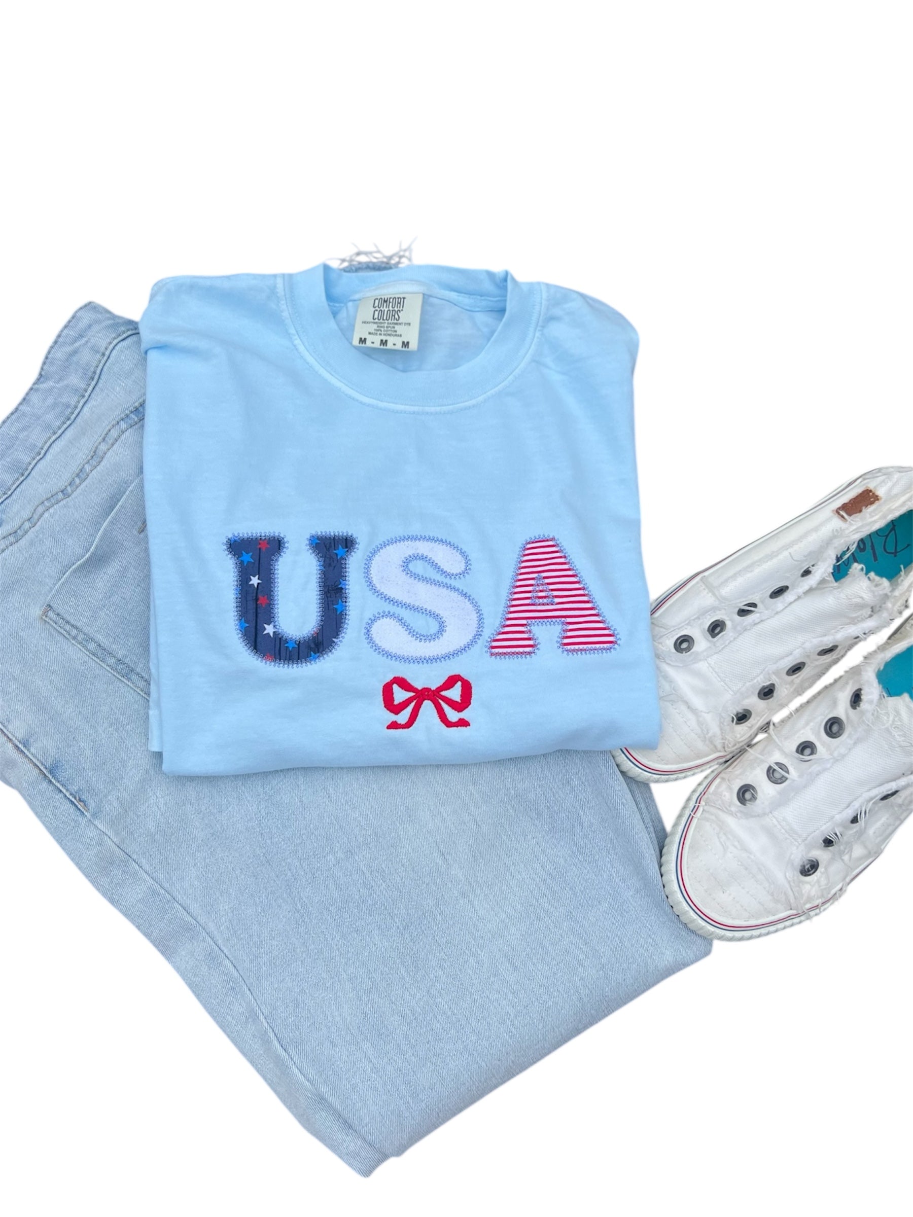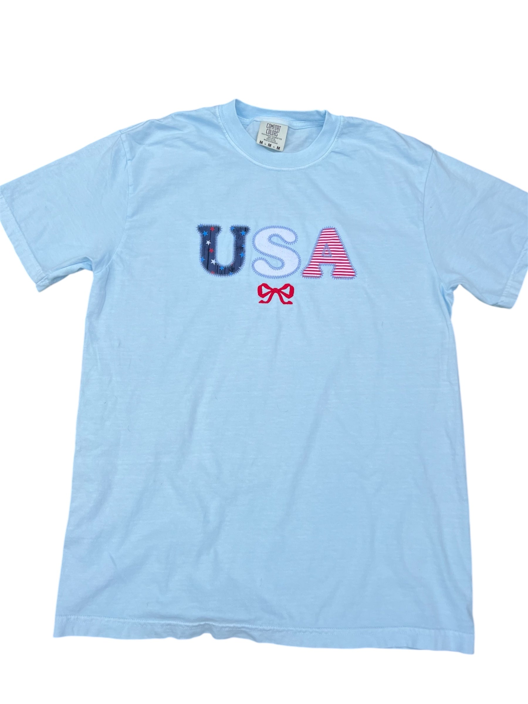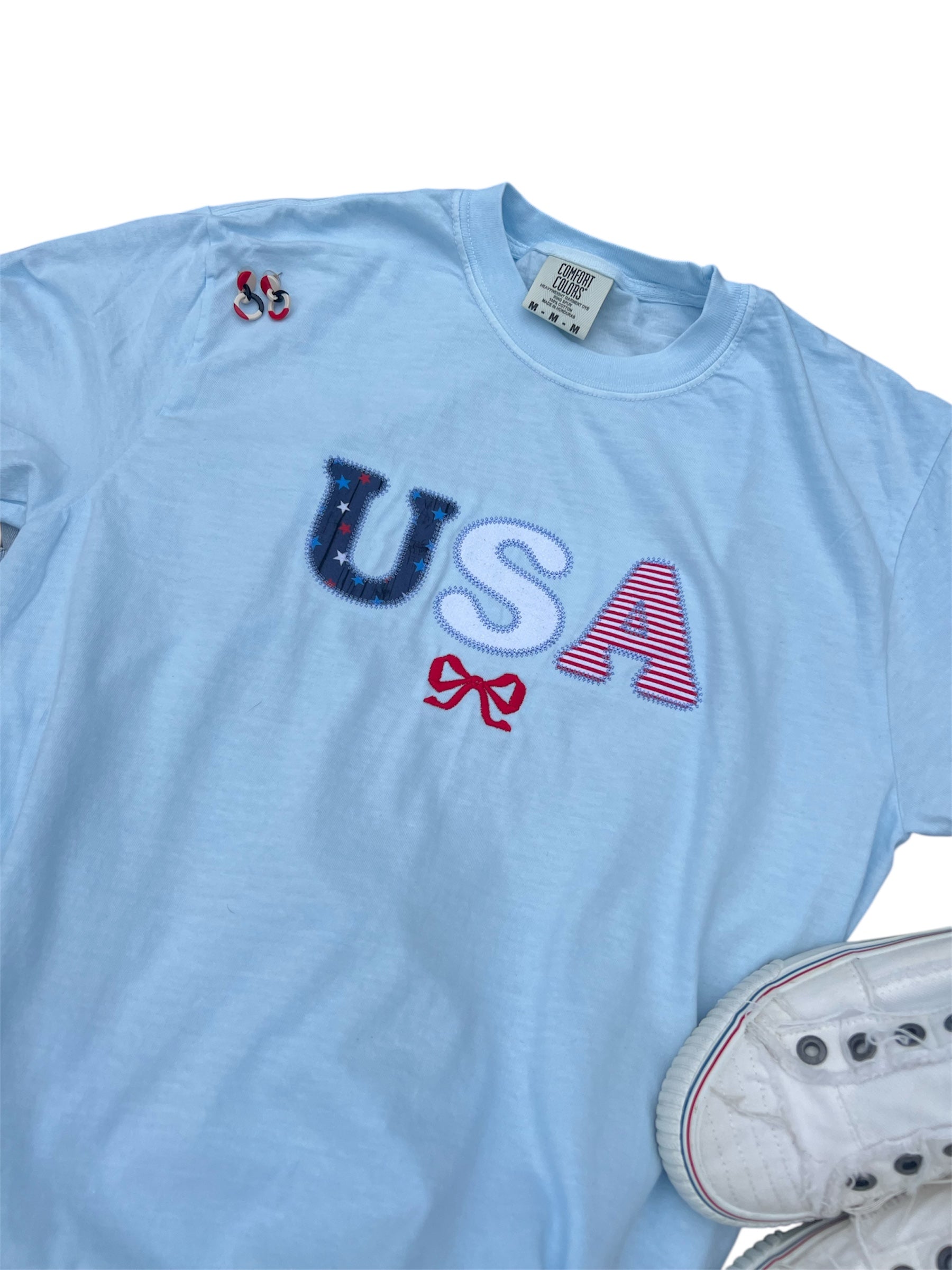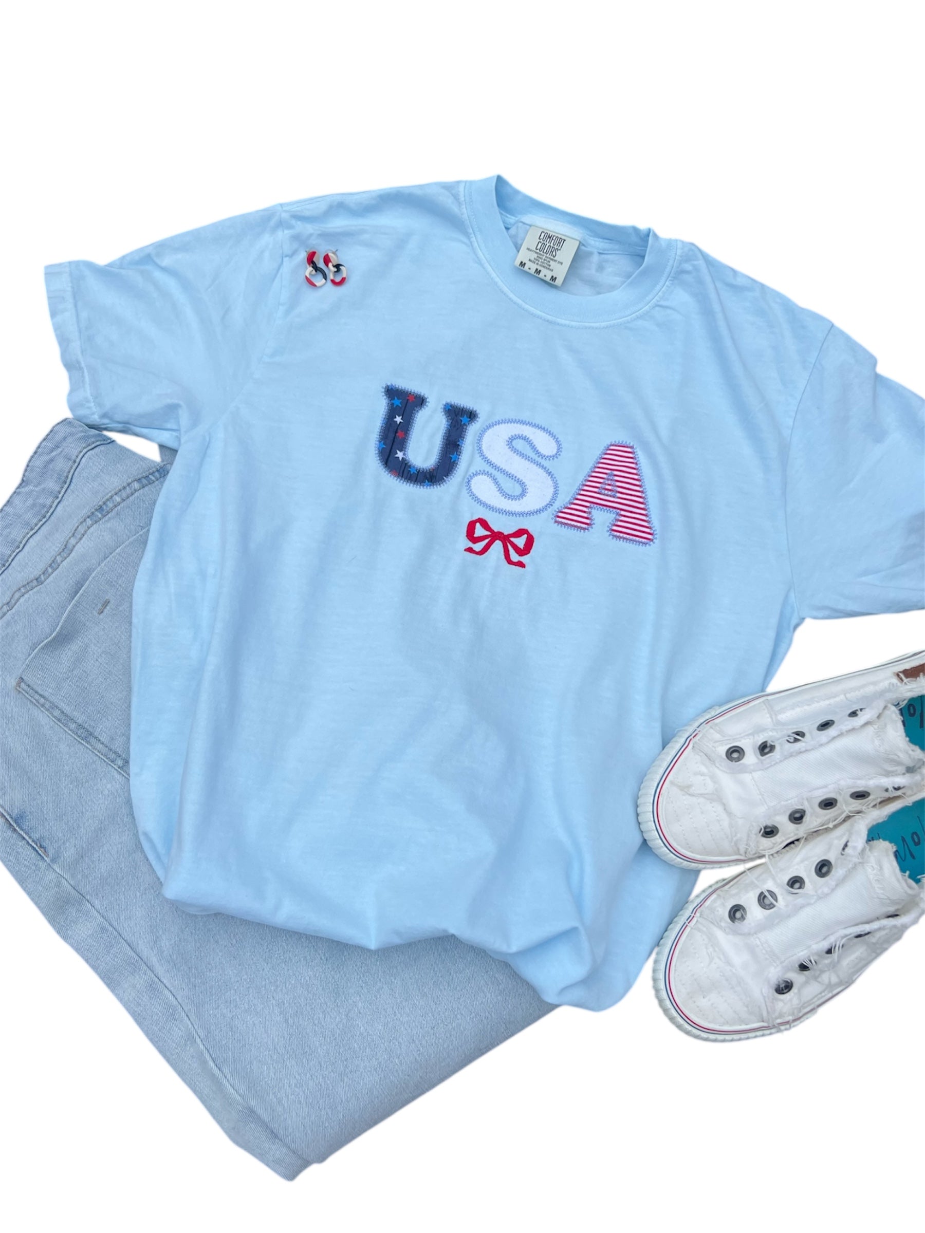USA Embroidered T-Shirt with Red Bow – Patriotic & Playful