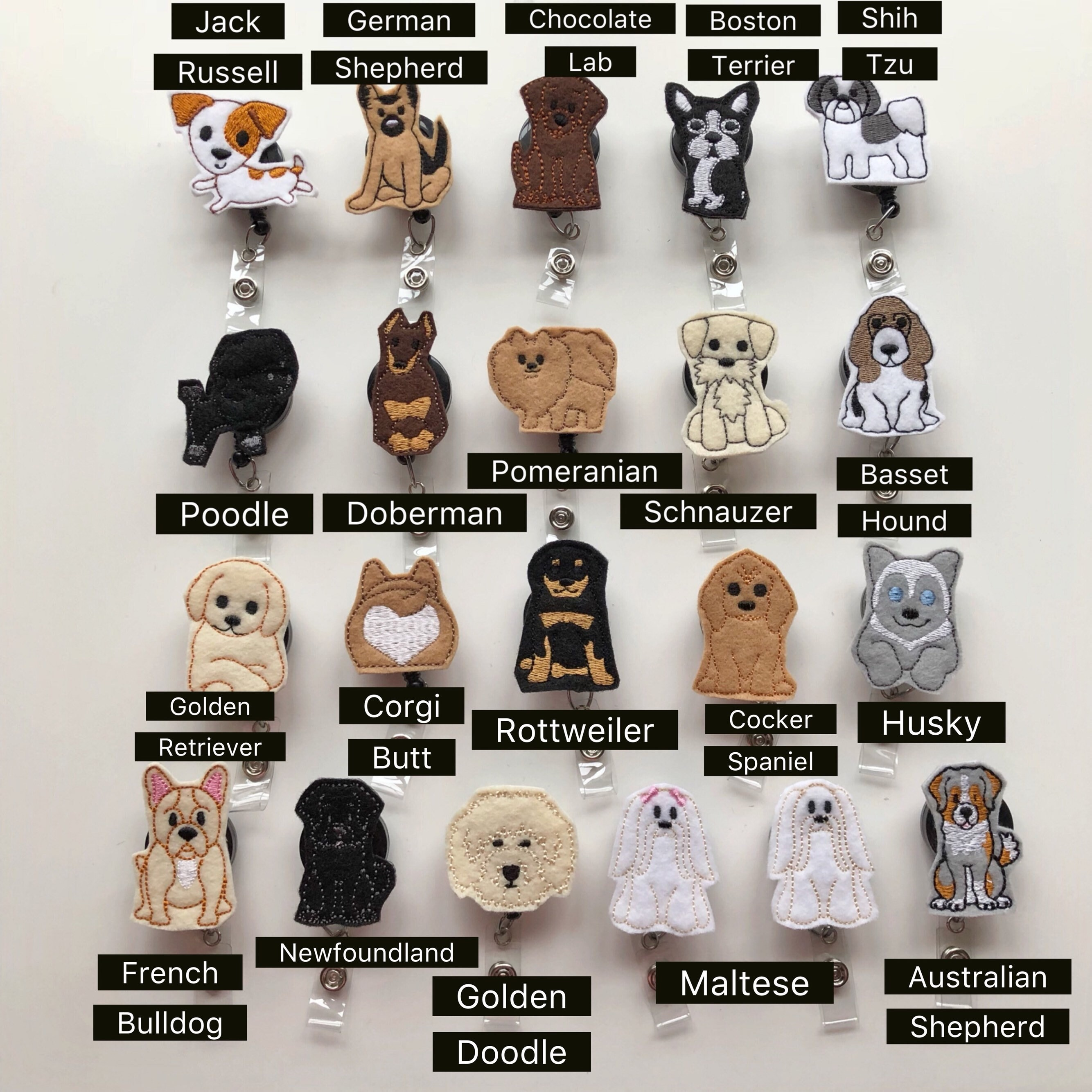 Dog patches are machine embroidered by me and then securely attached to your clip.